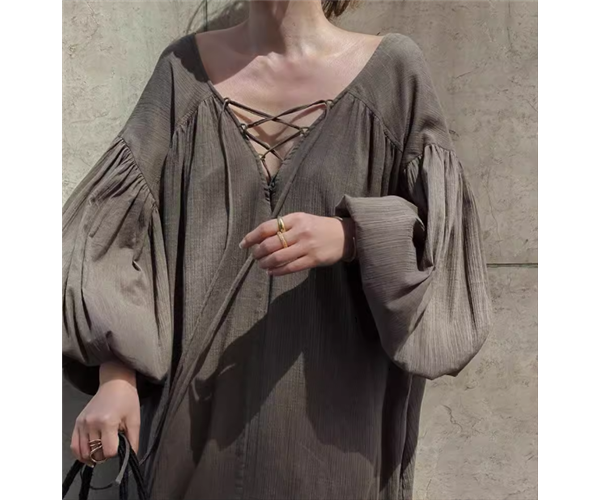 レディース ワンピース プルオーバー ロング マキシ 長袖 ボリューム袖 ドロップショルダー バルーン袖 ランタンスリーブ Vネック Aライン 背中開き フェミニン 編み上げ レースアップ リネン 綿 コットン 麻 大人可愛い きれいめ シンプル カジュアル おしゃれ かっこいい こなれ感 ガーリー ルーズ 個性的 クール エレガント 抜け感 ラグジュアリー 無地 春 秋 デート お出かけ 体型カバー 普段使い ゆったり ゆる フリーサイズ 大きめ オーバーサイズ ブラウン