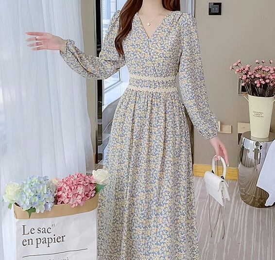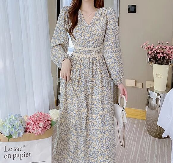 レディース ワンピース プルオーバー 膝下 ミモレ ロング 長袖 パフスリーブ Vネック スリム 細身 Aライン フェミニン ウエストマーク ハイウエスト かわいい 大人可愛い きれいめ 上品 おしゃれ レトロ ガーリー エレガント キュート シック 高級感 華やか 優しい 穏やか 花柄 フラワー プリント 小花柄 春 秋 デート お出かけ 普段使い モテ 清楚 S M L XL 大きいサイズ 小さめ ブルー パープル