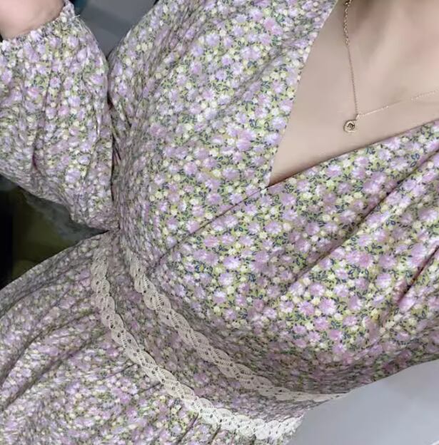 上品で清楚な印象の小花柄が可愛いミモレ丈の長袖ワンピース。