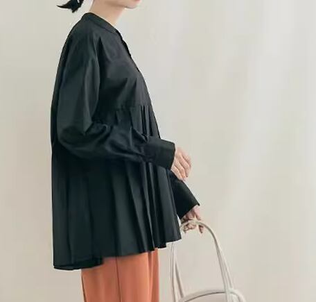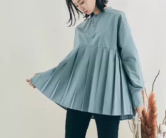 レディース トップス シャツ カットソー プルオーバー ミドル丈 長袖 スタンドカラー プリーツ タック 切り替えデザイン 綿 コットン かわいい 大人可愛い きれいめ シンプル カジュアル おしゃれ レトロ ボーイッシュ ルーズ 個性的 クール 存在感 ナチュラル 清潔感 ハンサム シック 無地 秋 デート お出かけ 体型カバー 普段使い 着回し M L ゆったりウエスト ホワイト ブラック カーキ ブルー