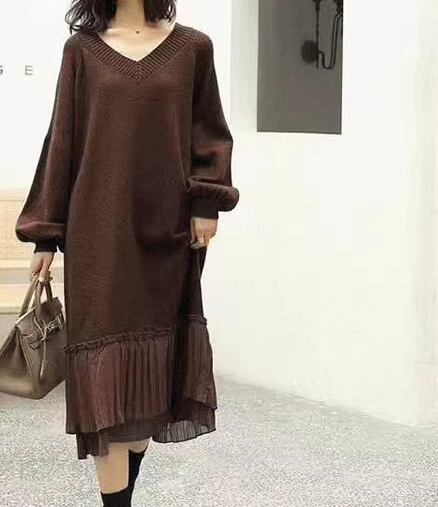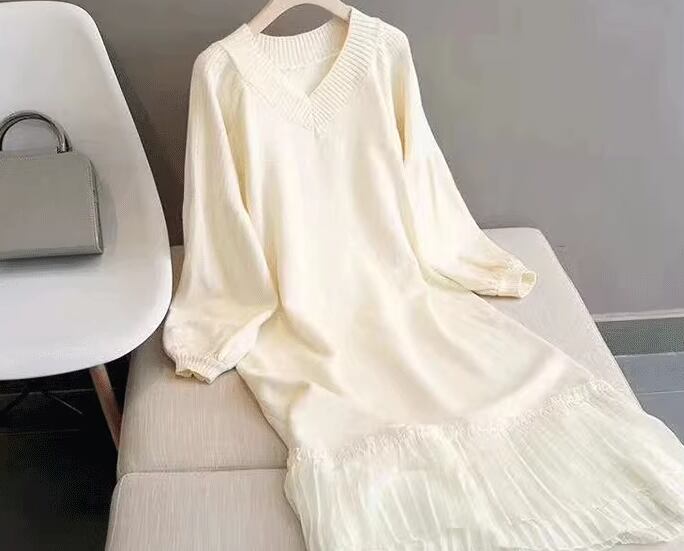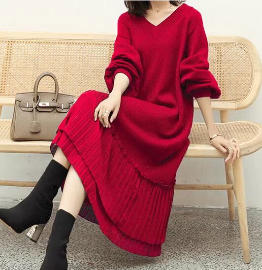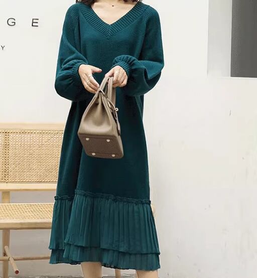 レディース ワンピース プルオーバー ニットワンピ ウール ミモレ ロング 長袖 Vネック Aライン フェミニン プリーツ 切り替えデザイン ドッキング かわいい 大人可愛い きれいめ シンプル カジュアル 上品 おしゃれ ガーリー 個性的 クール エレガント キュート 無地 秋 冬 デート お出かけ 韓国 楽ちん 体型カバー 普段使い モテ 清楚 ゆったり ゆる フリーサイズ 大きめ ブラック ブラウン オフホワイト レッド グリーン