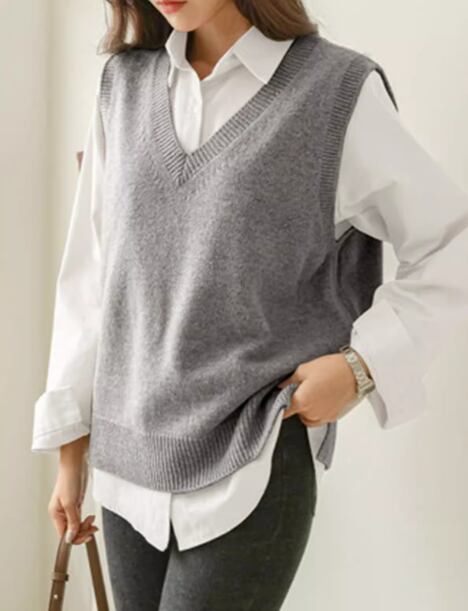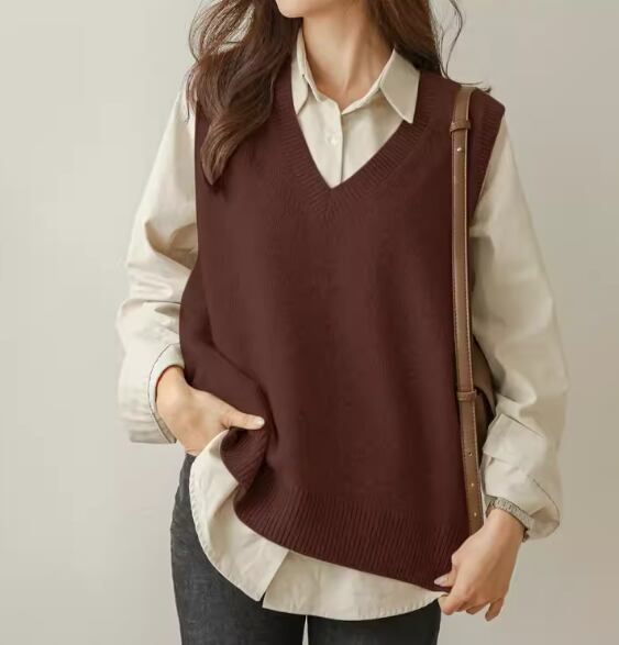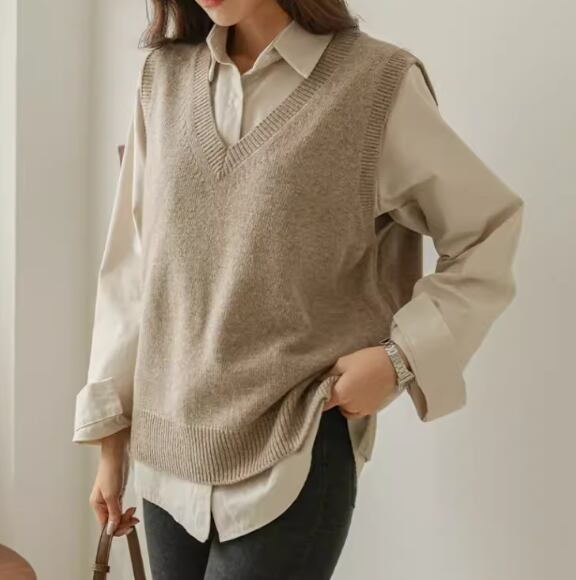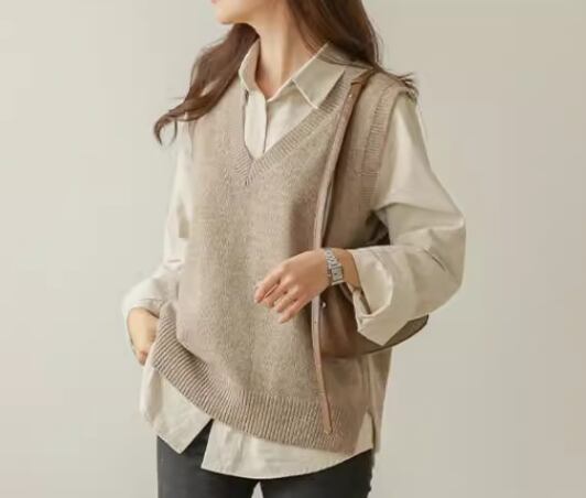 上品で落ち着いた秋カラーとシンプルなデザインが大人可愛いノースリーブのニットベスト。