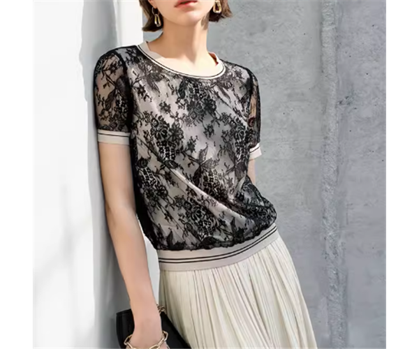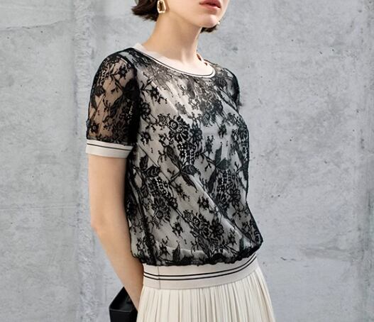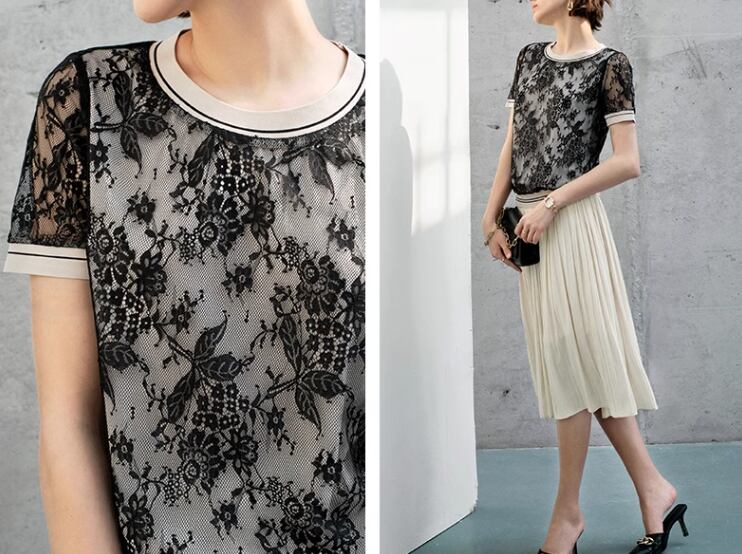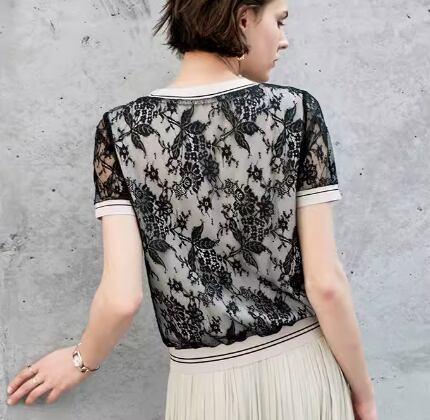 レディース トップス カットソー プルオーバー Tシャツ ミドル丈 半袖 ラウンドネック ストレート ドッキング フェミニン レース かわいい 大人可愛い きれいめ カジュアル 上品 おしゃれ かっこいい ガーリー 個性的 エレガント キュート ラグジュアリー 豪華 シック 高級感 華やか スタイリッシュ 優しい フェアリー 夏 デート お出かけ 女子会 休日 ショッピング 普段使い 着回し S M ブラック