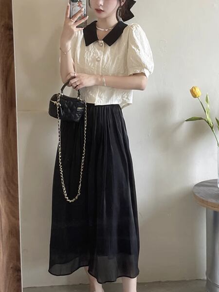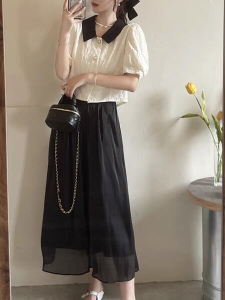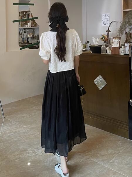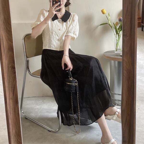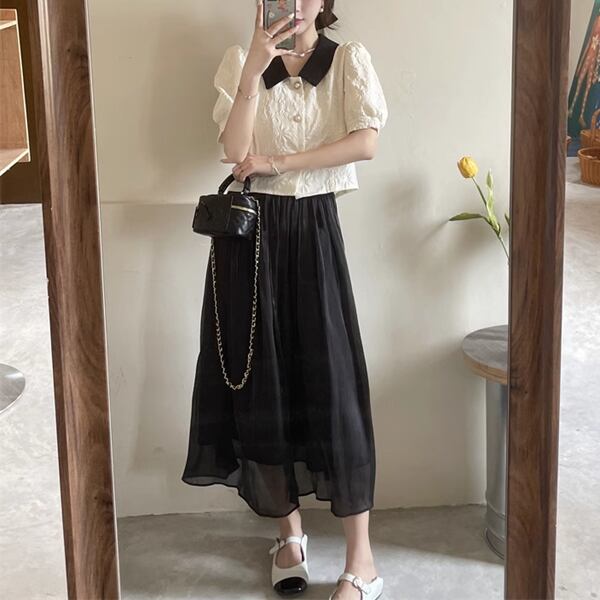 上下セット ツーピース レディース スカート セットアップ フレアスカート ロングスカート ロング Aライン 裾ワイド シフォン 大人可愛い カジュアル 上品 おしゃれ ガーリー フォーマル オフィスカジュアル 涼しげ 無地 春 夏 秋 ロングシーズン シーズンレス 10代 20代 オフィス 通勤 普段使い ゆったりウエスト トップス シャツ ブラウス 半袖 パフスリーブ ポロカラー セミフレア ストレート