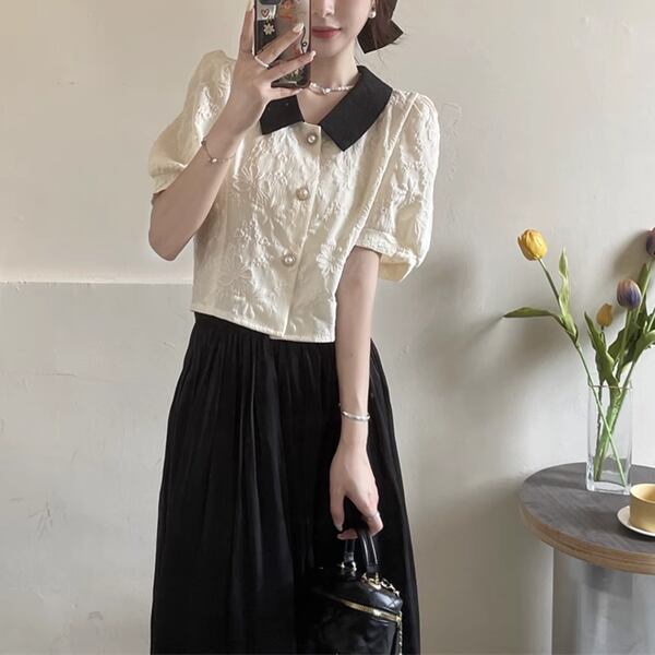 アプリコットのシャツ×ブラックのスカート