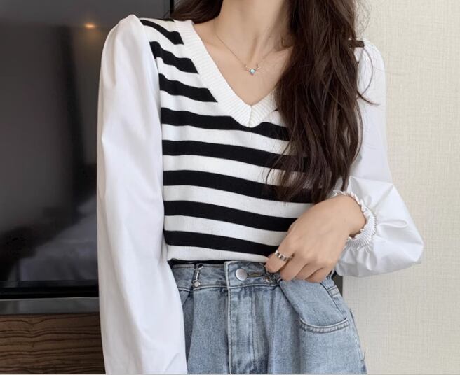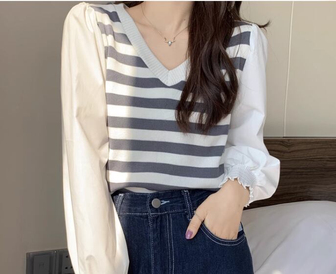 重ね着風のドッキングデザインがおしゃれなボーダー模様の長袖のVネックセーター。