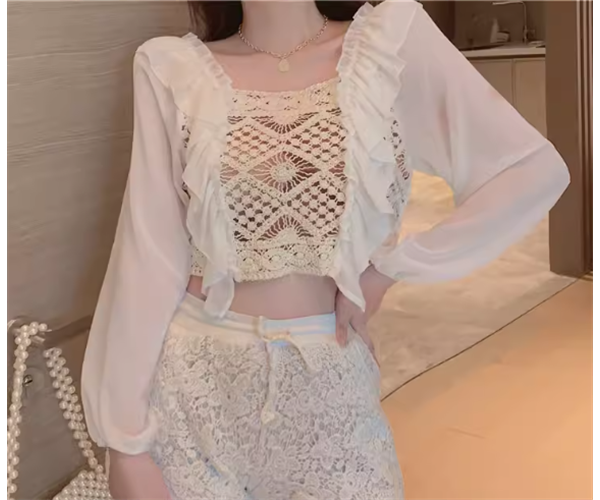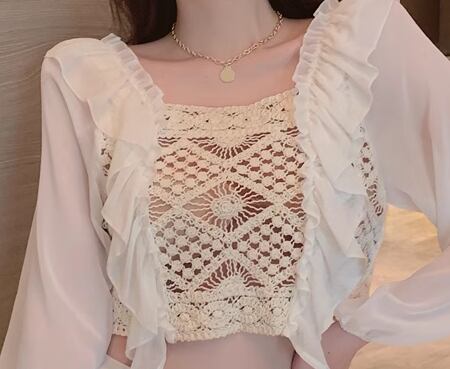 かぎ針編みのデザインとフリルがついたシャツがおしゃれな長袖のドッキングシャツ。