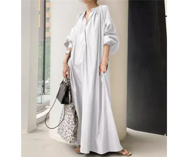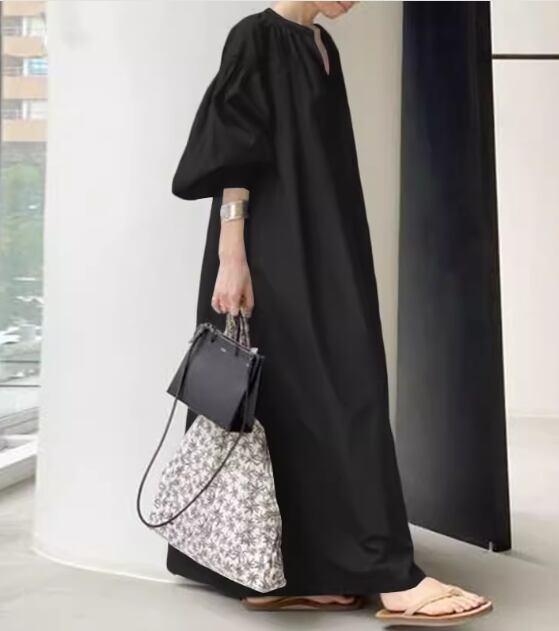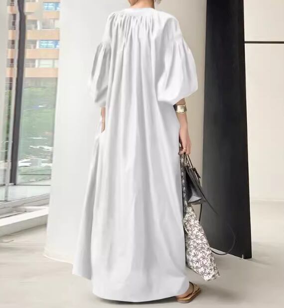 レディース ワンピース プルオーバー ロング マキシ 5分袖 ボリューム袖 バルーン袖 ランタンスリーブ ポケット リネン 綿 コットン 大人可愛い シンプル カジュアル 上品 おしゃれ かっこいい レトロ こなれ感 ラフ ルーズ クール ナチュラル リラックス シック 高級感 無地 秋 ママ OL デート お出かけ 体型カバー 普段使い S M L XL 大きいサイズ ゆったり ゆる 大きめ ホワイト ブラック カーキ