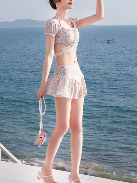 全3色 ツーピースボクサースカートスタイル水着 レディース ビキニ セパレート バンドゥ カジュアル水着 ホルターネック 半袖 ミッドスリーブ ツーピース 上下セット リボン ハイウエスト 伸縮性 かわいい 大人可愛い カジュアル 華やか 大人っぽい おしゃれ キュート かっこいい 涼しげ 小花柄 リゾート プール 夏 海