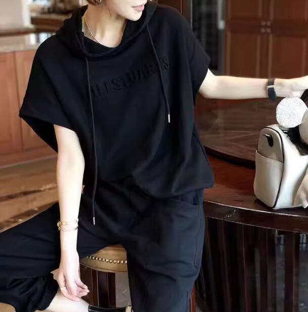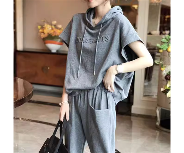 半袖のプルオーバーパーカーとフルレングスのカジュアルパンツの二点セットです。