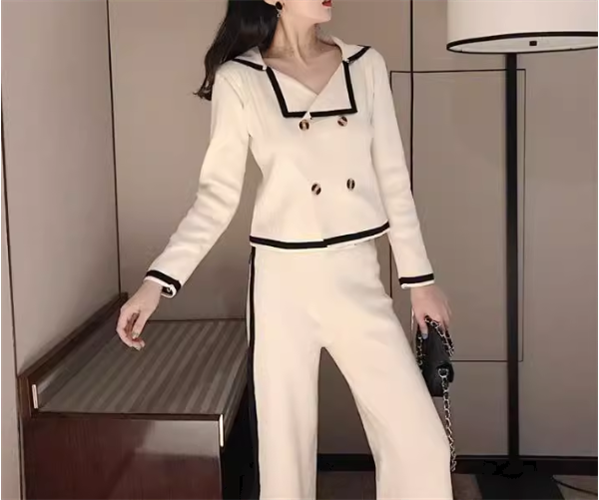 異国風のデザインがおしゃれなニットジャケットとフルレングスのニットパンツの二点セットです。