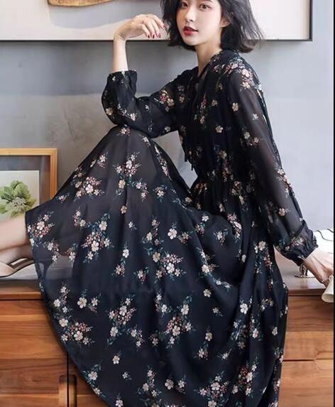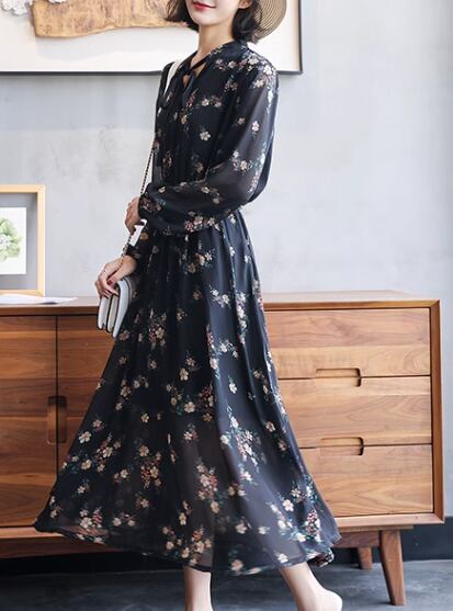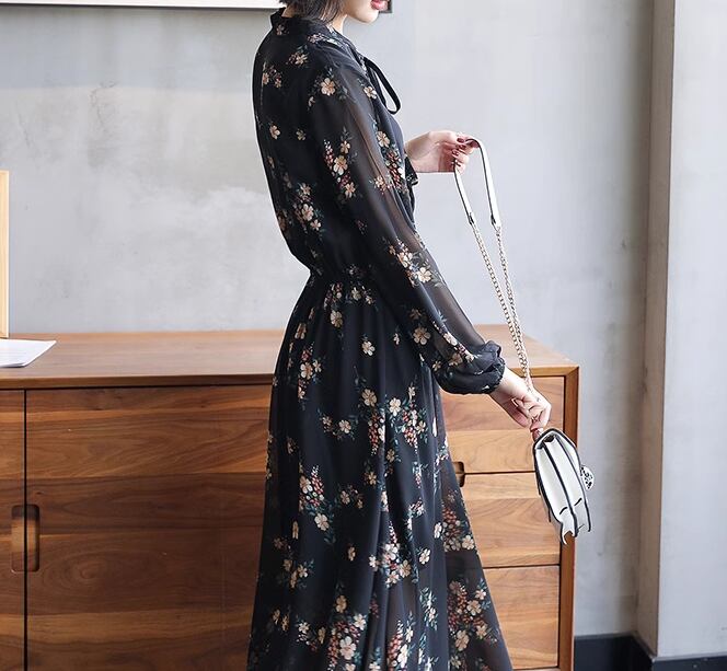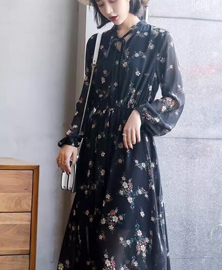 レディース ワンピース プルオーバー ロング 長袖 ボリューム袖 バルーン袖 ランタンスリーブ Vネック フレア Aライン フェミニン シフォン リボン ウエストマーク ハイウエスト かわいい 大人可愛い きれいめ カジュアル 上品 おしゃれ レトロ ガーリー エレガント キュート 清潔感 爽やか シック 高級感 花柄 フラワー プリント 春 秋 デート お出かけ 普段使い モテ 清楚 トレンド 流行 M L XL 大きいサイズ ブラック