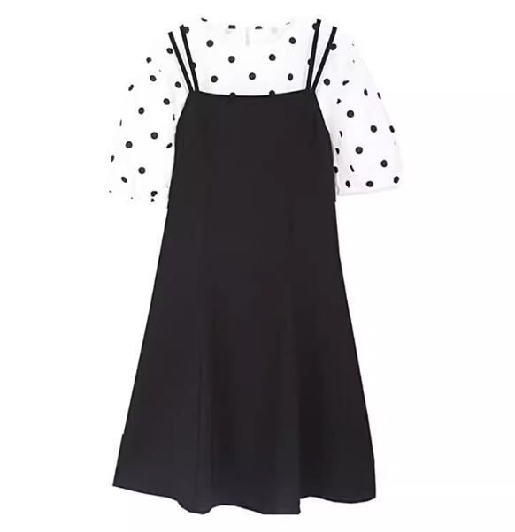大きめのドット柄がレトロで可愛い半袖カットソーと膝丈までのシンプルなキャミワンピースの二点セット。