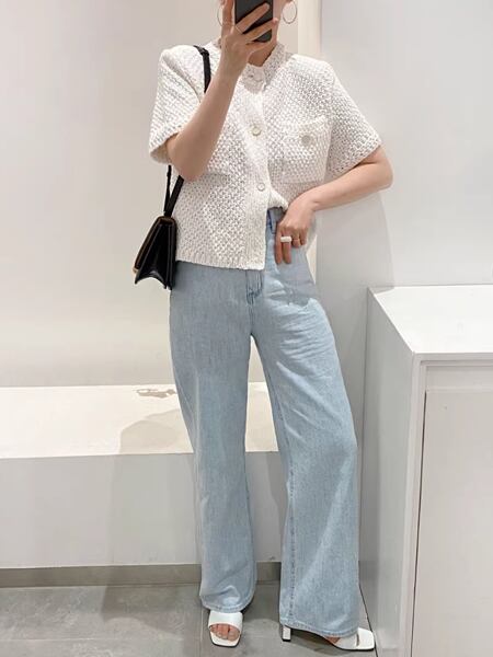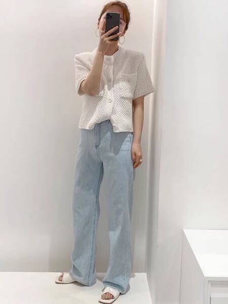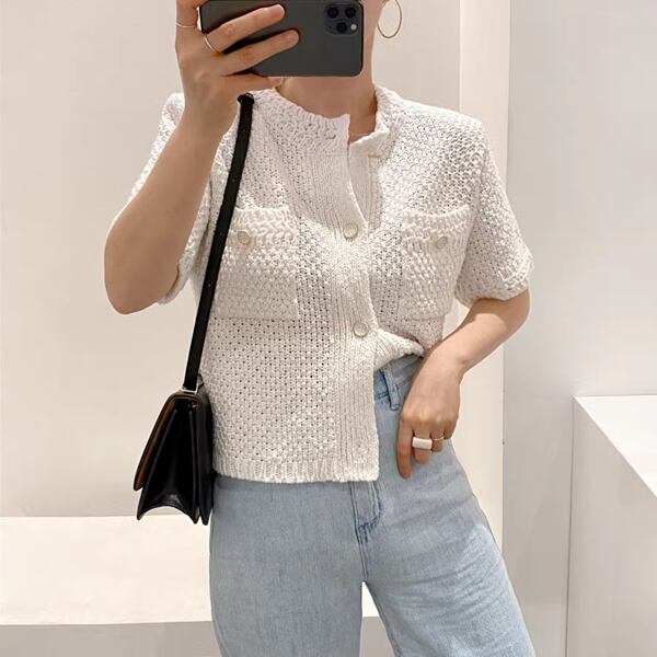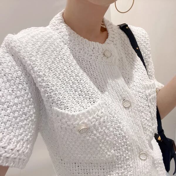 シンプルながらもスタイリッシュなデザインの半袖ニットカーディガン。ラウンドネックでシングルブレストデザインです。どんなコーディネートにも合わせやすく、着心地も抜群。ソリッドカラーのシンプルさが、さまざまなシーンで活躍するアイテムです。快適な着心地で、春から秋にかけての装いに華を添えます。