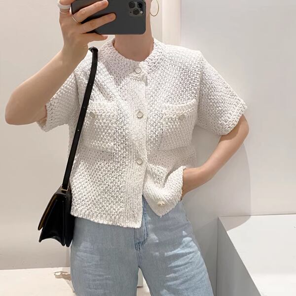 シンプルな半袖ニットカーディガン レディース トップス ニット カーディガン サマーニット アウター 前開き 長袖 ラウンドネック スリム 細身 ストレート フォーマル フェミニン ポケット ボタン リブニット きれいめ シンプル カジュアル 上品 おしゃれ ガーリー モード系 エレガント 清潔感 無地 春 夏 秋 10代 20代 オフィス 通勤 お出かけ イベント ショッピング コンサート ドライブ 韓国 清楚