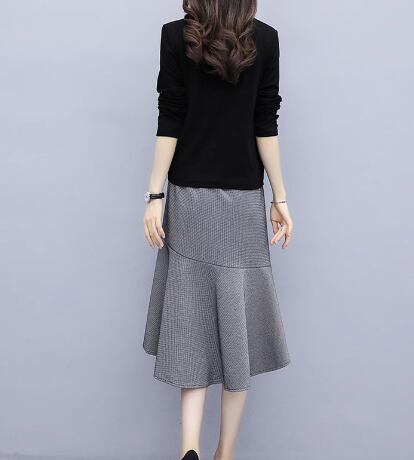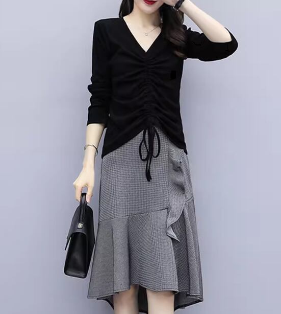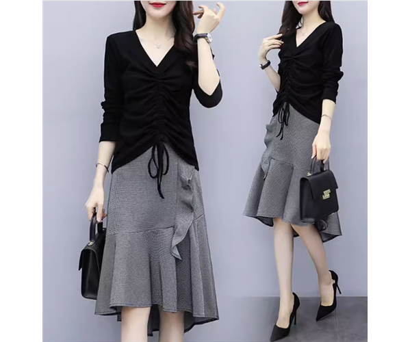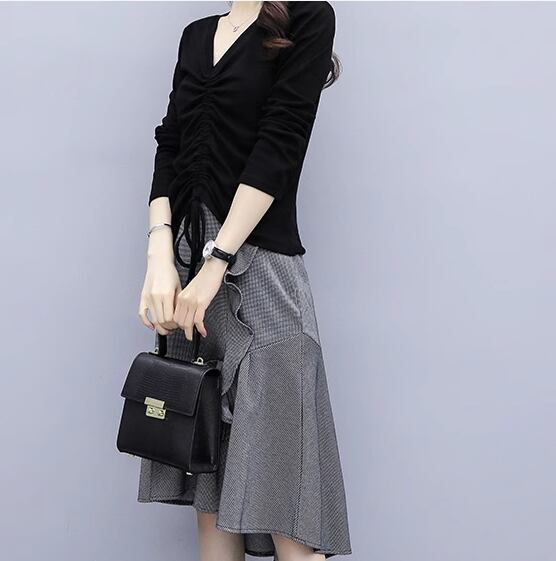 二点セット 上下セット ツーピース レディース スカート トップス カットソー プルオーバー セットアップ 膝丈 ミモレ アシンメトリー 左右非対称 長袖 Vネック フェミニン フリル リボン ウエストゴム かわいい 大人可愛い きれいめ シンプル 上品 おしゃれ ガーリー 個性的 エレガント キュート ラグジュアリー 無地 春 秋 デート お出かけ 普段使い 着回し M L XL 大きいサイズ ブラック グレー