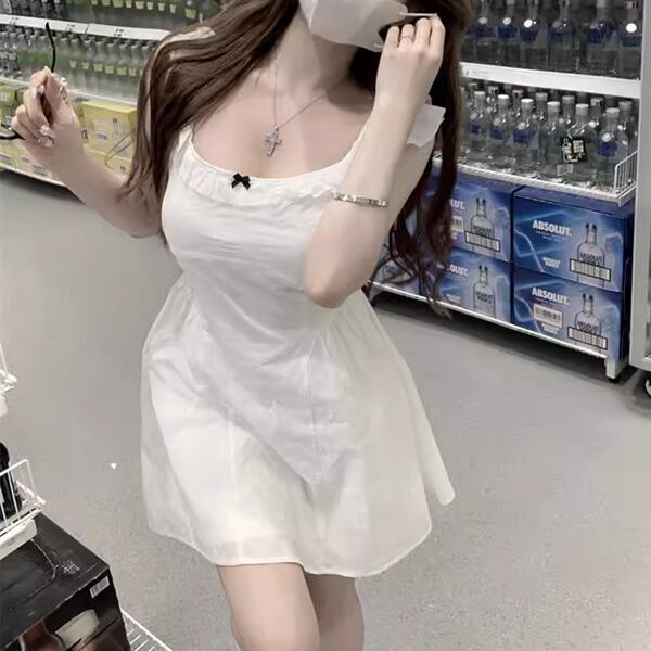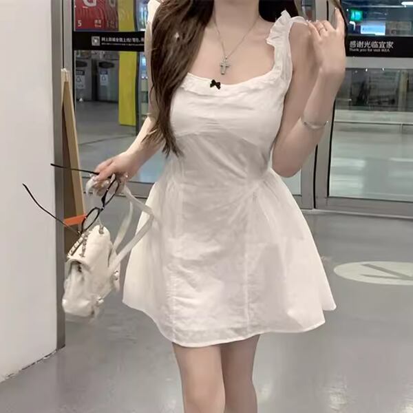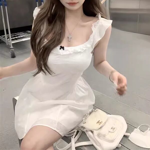 フライングスリーブ&スクエアネックのドレス レディース ワンピース ドレス フレア ミニ 膝上 袖なし ノースリーブ スクエアネック スリム Aライン フェミニン ハイウエスト かわいい カジュアル 上品 おしゃれ ガーリー モード系 エレガント キュート 爽やか ファンシー 優しい 涼しげ 無地 夏 発表会 冠婚葬祭 10代 20代 お出かけ パーティー レストラン ホテル コンサート 合コン コーデ