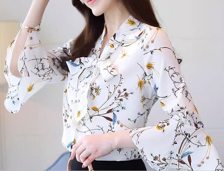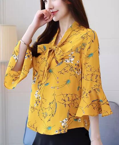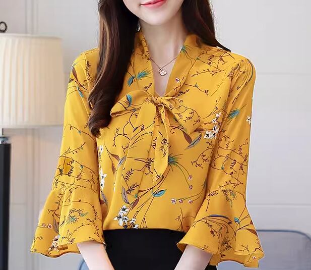 レディース トップス シャツ プルオーバー ミドル丈 7分袖 長袖 ベルスリーブ Vネック りぼんタイ フェミニン シフォン フリル かわいい 大人可愛い きれいめ カジュアル 上品 おしゃれ こなれ感 ガーリー エレガント 存在感 ラグジュアリー シック 高級感 華やか 優しい 穏やか フェアリー ボタニカル プリント 春 デート お出かけ 普段使い 着回し S M L XL 大きいサイズ ホワイト イエロー