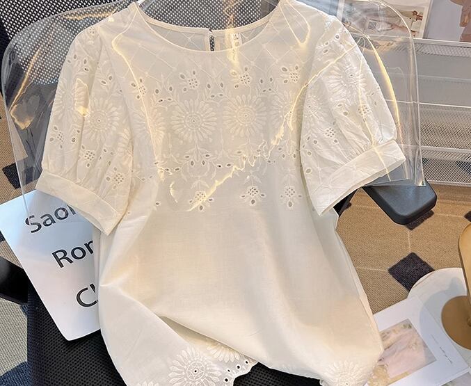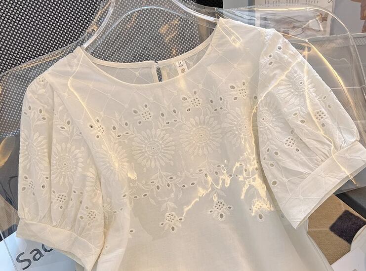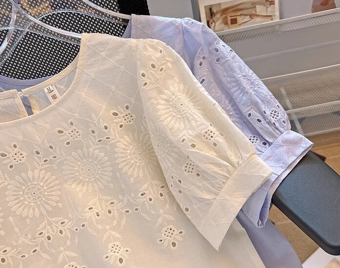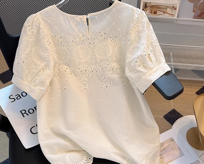 上品で落ち着いた色味と繊細でエレガントな刺繍が魅力的な大人可愛い雰囲気の半袖Tシャツ。