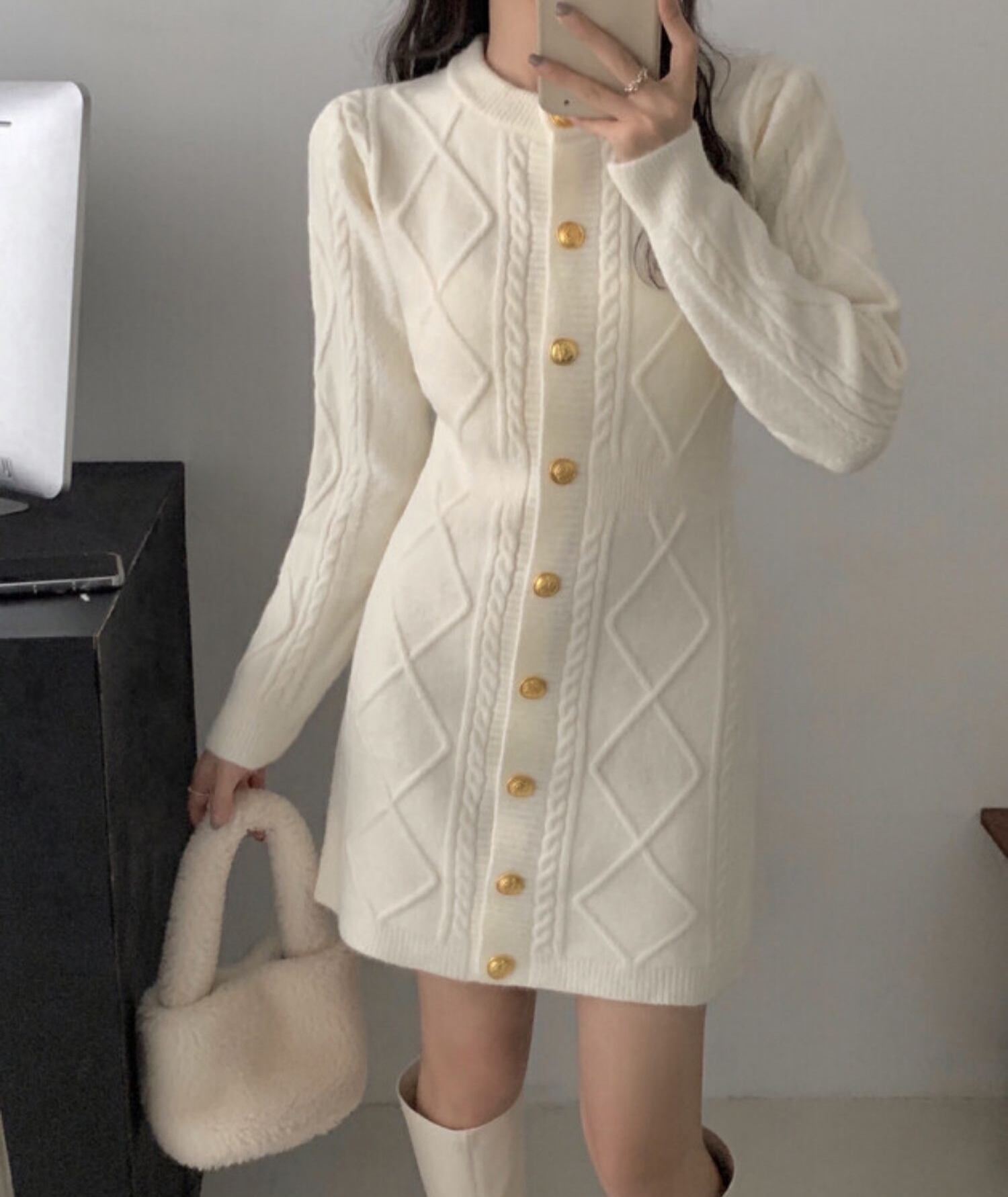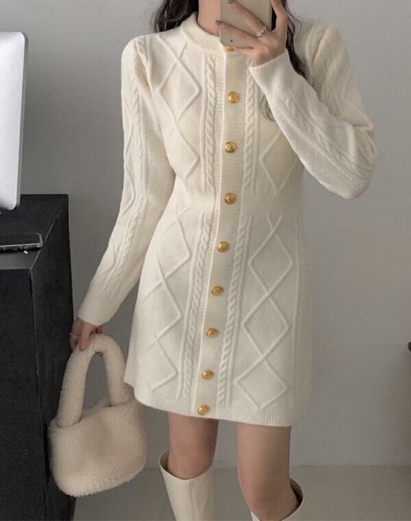レディース ワンピース ニットワンピ 前開き ミニ ショート 長袖 ラウンドネック 襟なし スリム 細身 フェミニン 前開き リブニット ニット かわいい カジュアル ガーリー 主役級 存在感 ラブリー 立体模様 ダイヤ 菱形 秋 冬 デート 女子会 楽ちん 暖かい 普段使い モテ S M L XL ブラック オフホワイト