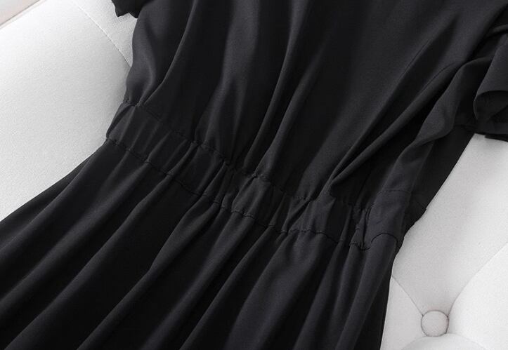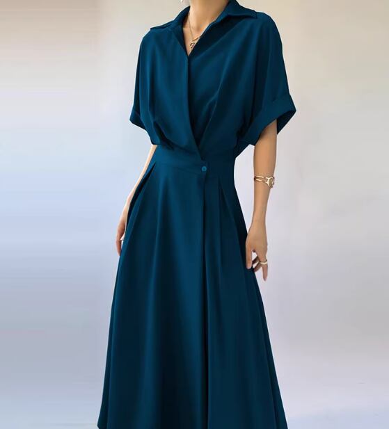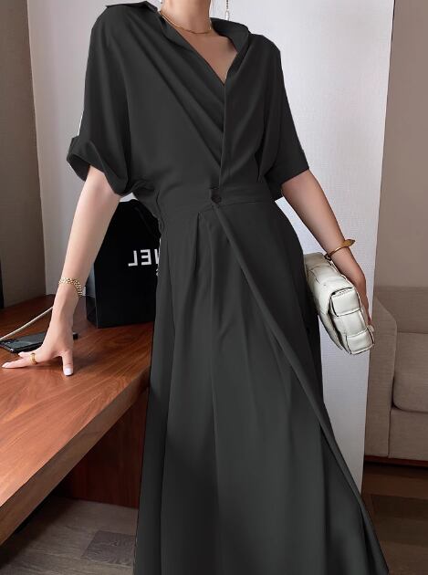 レディース ワンピース プルオーバー ロング 半袖 Vネック カシュクール 襟付き ポロカラー Aライン フェミニン プリーツ ウエストマーク 大人可愛い きれいめ シンプル カジュアル 上品 おしゃれ かっこいい レトロ クール エレガント ラグジュアリー ナチュラル 知的 清潔感 ハンサム シック 高級感 無地 夏 デート お出かけ 体型カバー 普段使い M L XL 大きいサイズ ゆったり ゆる 大きめ ブラック カーキ ブルー