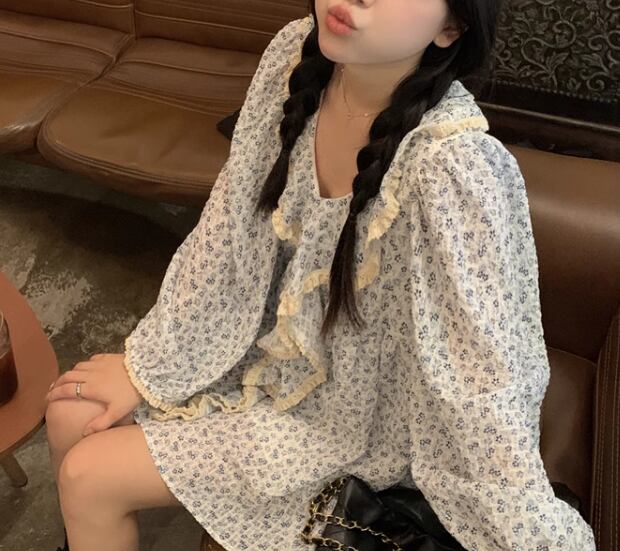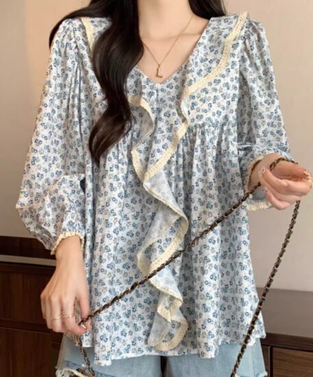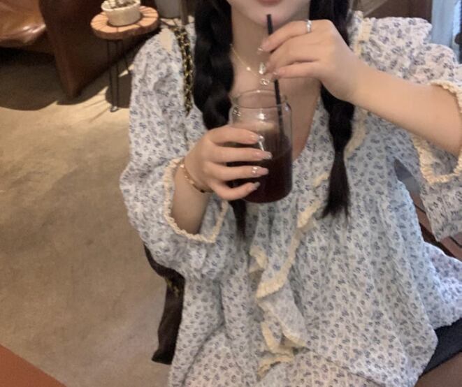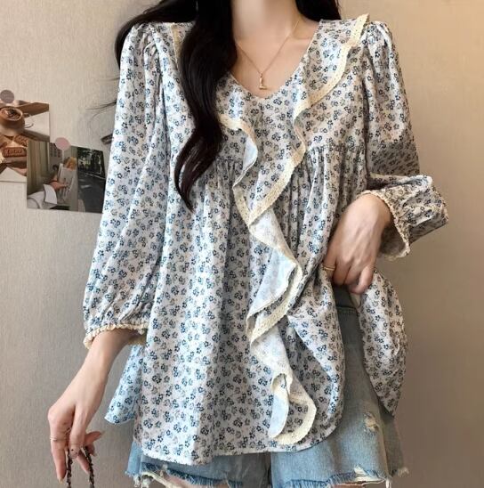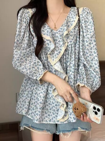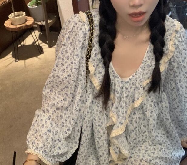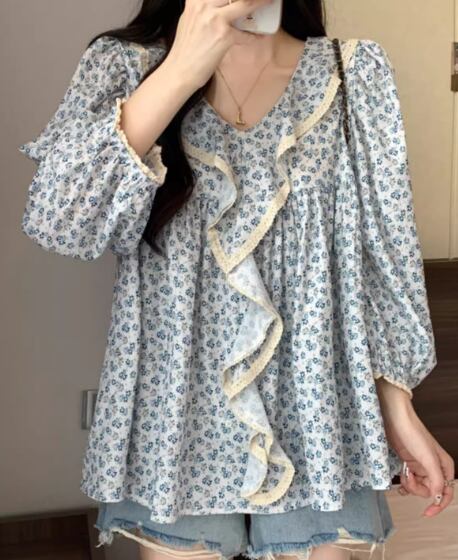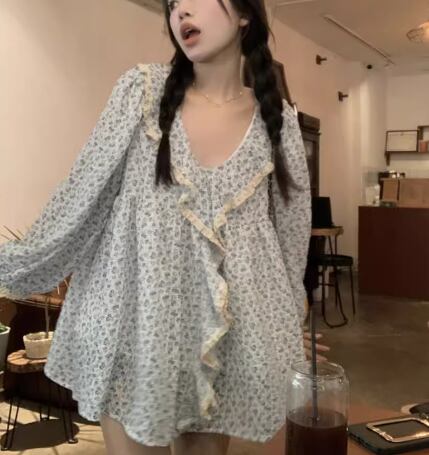 可憐な小花柄とガーリーなフリルが可愛らしい長袖シャツ。