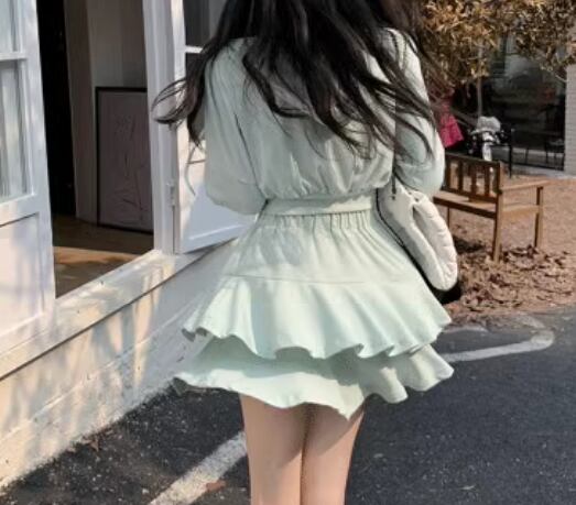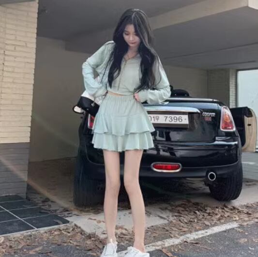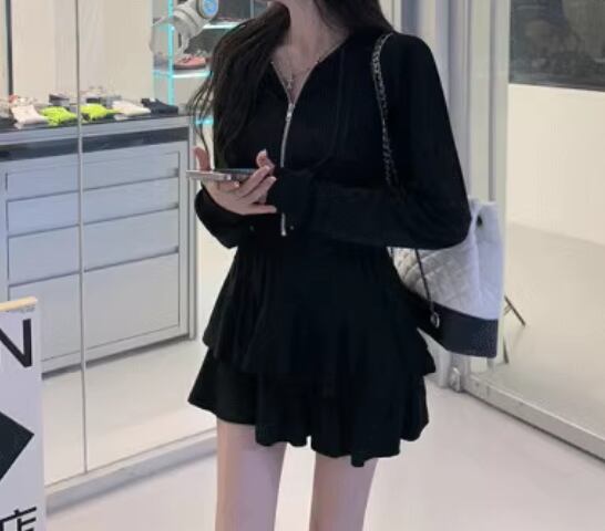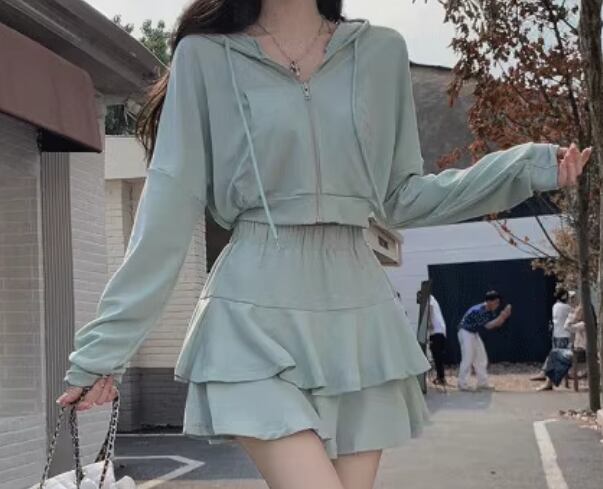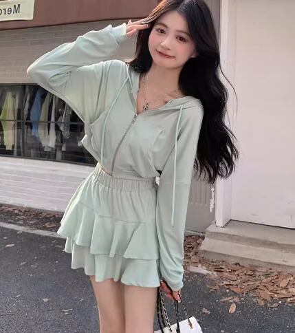 二点セット 上下セット ツーピース レディース スカート パーカー セットアップ ショートスカート ミニスカート 長袖 フリル ファスナー 前開き ウエストゴム 薄手 かわいい 大人可愛い シンプル カジュアル おしゃれ ラフ ガーリー ルーズ ラブリー キュート ラグジュアリー アクティブ セクシー 無地 春 夏 秋 10代 20代 学生 デート お出かけ 普段使い 着回し M L XL 大きいサイズ ブラック グレー パステル グリーン