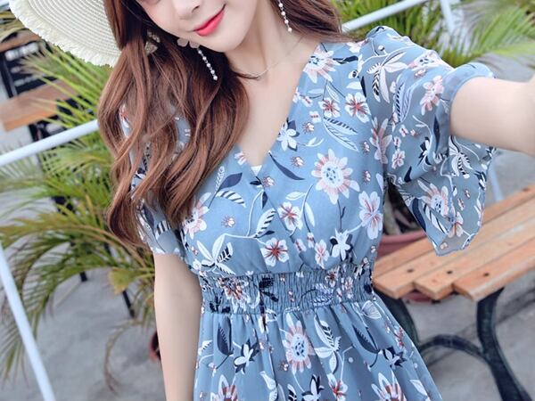 夏のビーチシーンに華やかさをプラスする、プラスサイズ対応の花柄ドレス。ファッショナブルでレトロなデザインが特徴で、シフォン素材のロングスカートが涼しげ。スリムなシルエットで体型を美しく引き立て、夏の装いをエレガントに演出します。