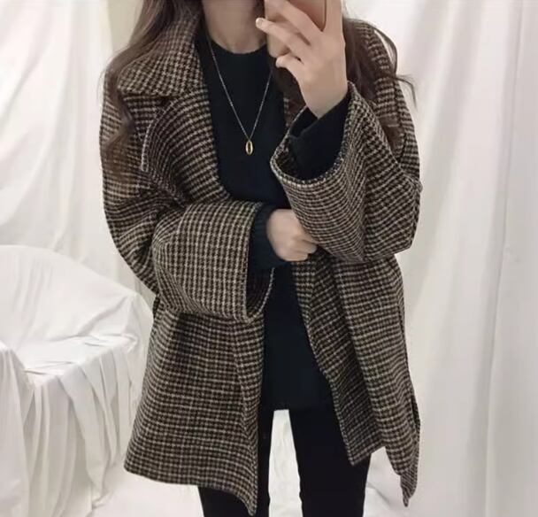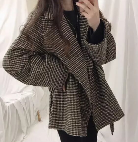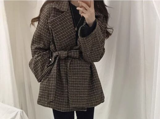 レディース コート アウター 上着 ウール ミドル丈 長袖 襟付き スーツカラー ウエストマーク ウエストリボン ポケット 異国風 かわいい 大人可愛い きれいめ カジュアル 上品 おしゃれ かっこいい レトロ こなれ感 エレガント キュート ラグジュアリー ハンサム シック 高級感 スタイリッシュ チェック 秋 冬 デート お出かけ 韓国 普段使い 着回し M L XL 大きいサイズ ブラウン