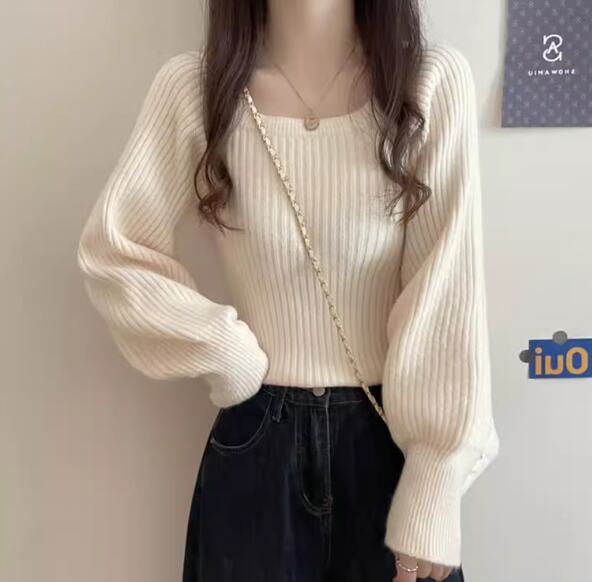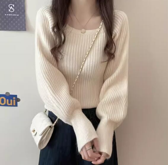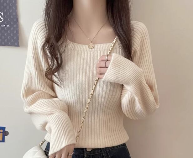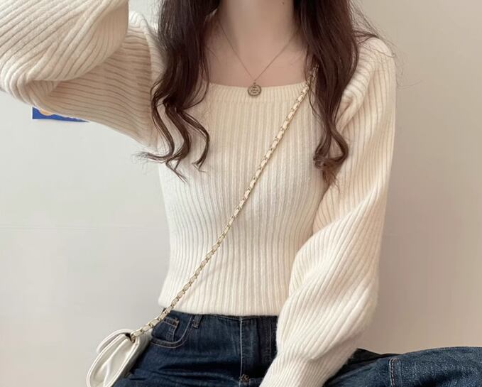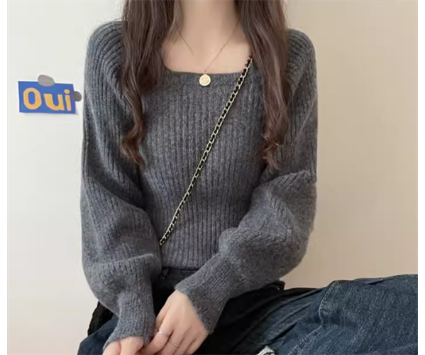 上品で落ち着いた色味が大人っぽいスクエアネックの長袖ニットセーター。