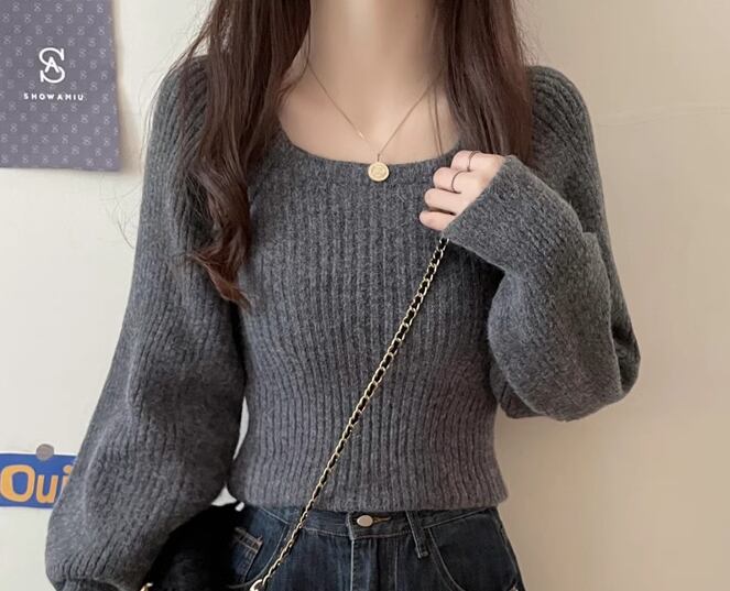 レディース トップス ニット セーター プルオーバー ミドル丈 長袖 ボリューム袖 パフスリーブ バルーン袖 スクエアネック 厚手 ストレッチ 伸縮性 かわいい 大人可愛い きれいめ シンプル カジュアル 上品 おしゃれ エレガント キュート ナチュラル シック 高級感 優しい 穏やか 春 秋 デート お出かけ 普段使い 着回し 定番 フリーサイズ ブラック グレー メタリック