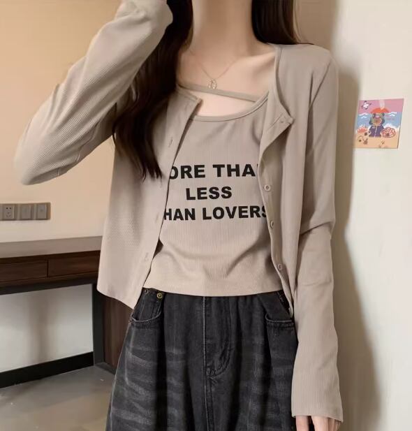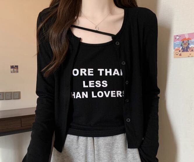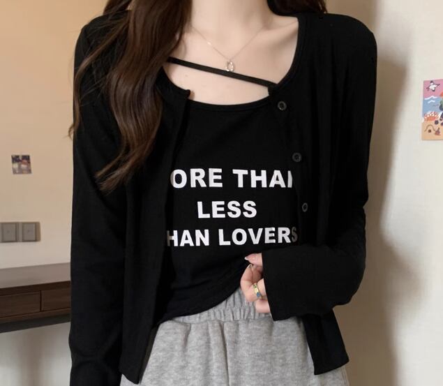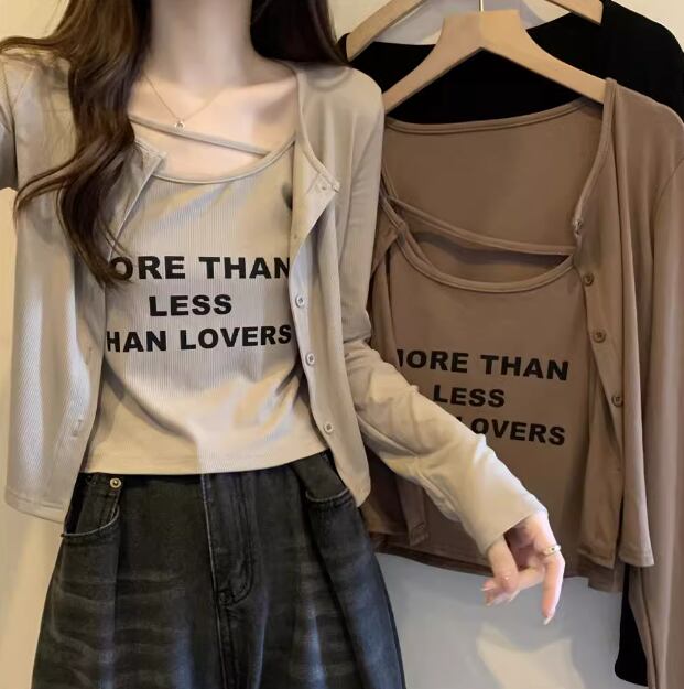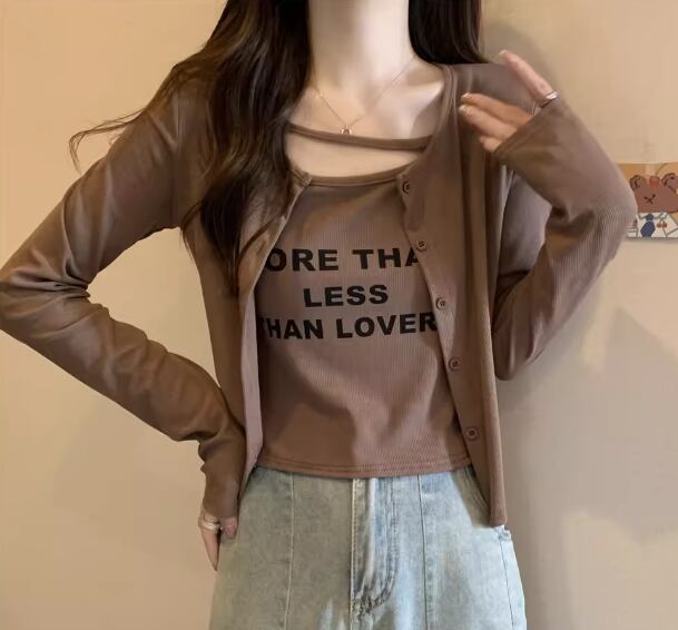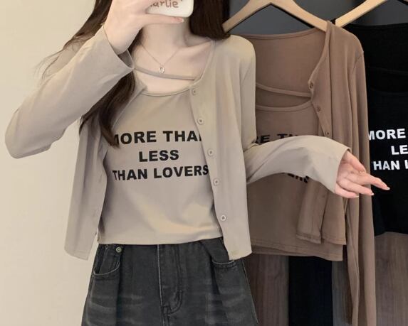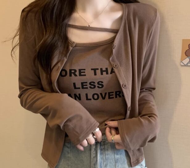 二点セット ツーピース レディース トップス カーディガン キャミソール アンサンブル ショート クロップド丈 長袖 ラウンドネック ストリート 大人可愛い カジュアル おしゃれ かっこいい こなれ感 ラフ ボーイッシュ 個性的 クール 抜け感 ラグジュアリー プリント 文字 テキスト 英語 春 秋 10代 20代 学生 デート お出かけ 重ね着 普段使い 着回し レイヤード M L XL 大きいサイズ ブラック ブラウン グレー カーキ
