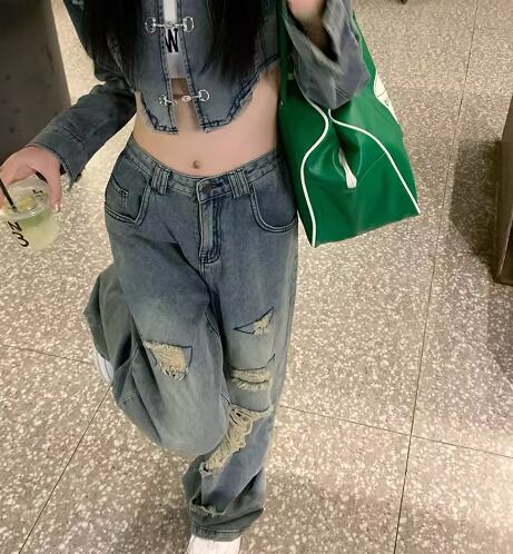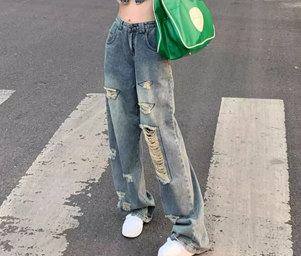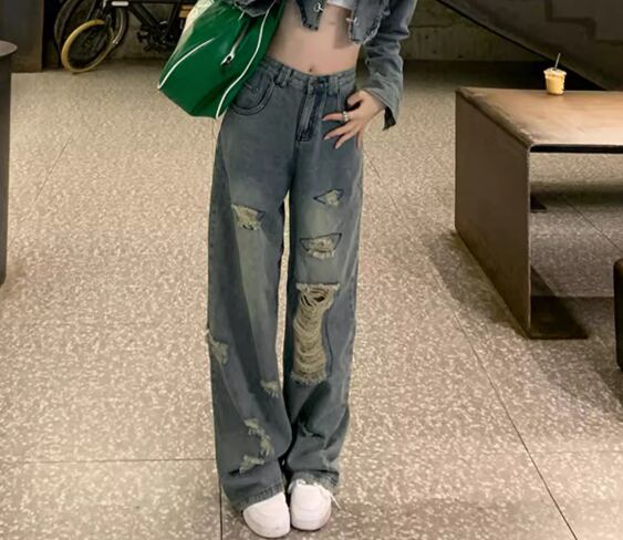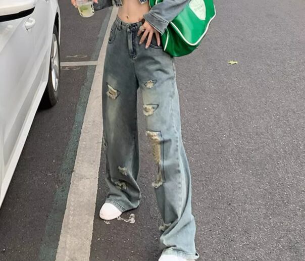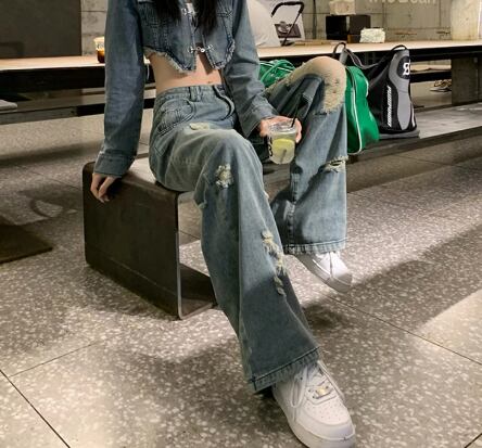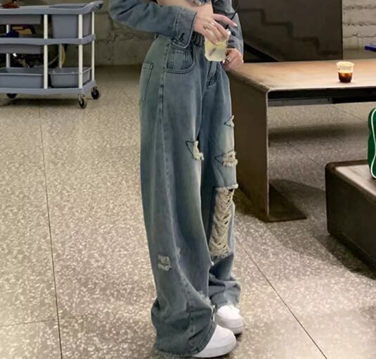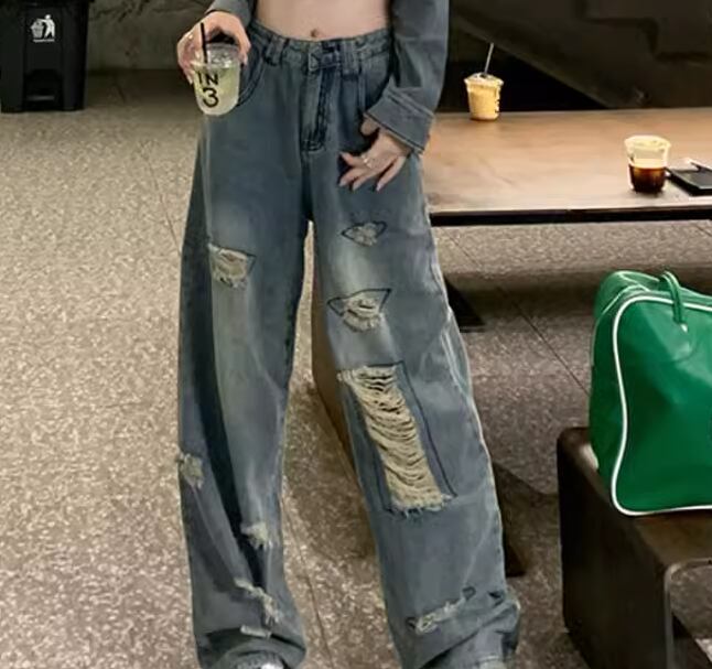 レディース パンツ ボトムス ジーンズ Gパン フルレングス ワイド ストリート ハイウエスト ダメージ ウォッシュ デニム ブルーデニム シンプル カジュアル おしゃれ かっこいい レトロ こなれ感 ラフ メンズライク ボーイッシュ ルーズ クール 抜け感 ラグジュアリー アメリカン ワイルド 無地 春 10代 20代 学生 デート お出かけ 体型カバー 脚長 普段使い 着回し S M L ゆったり ブルー