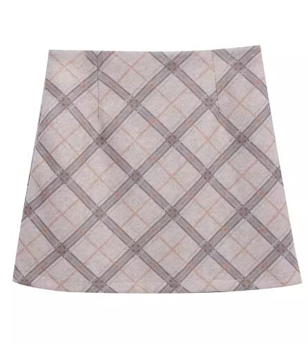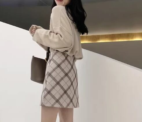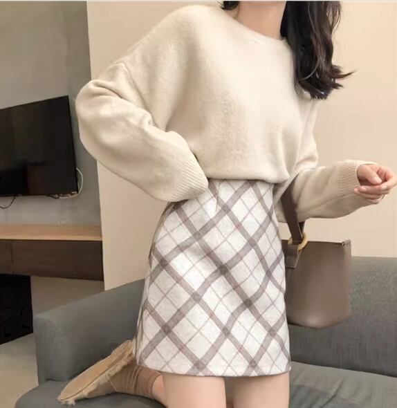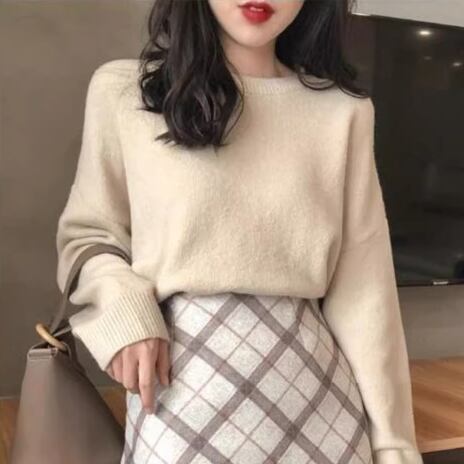 シンプルで着回し力抜群なアプリコットカラーの長袖ニットセーターとチェック柄が大人可愛いショート丈スカートの二点セット。