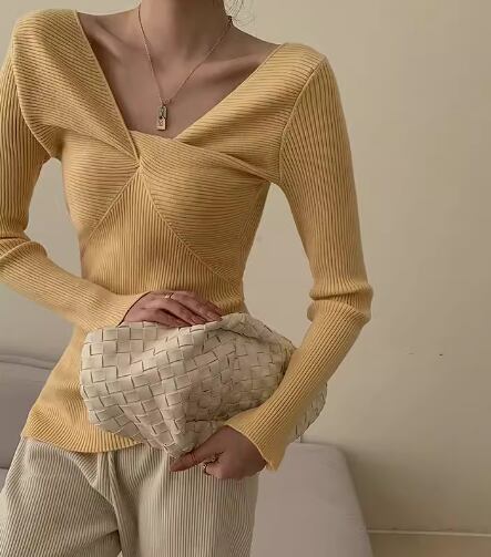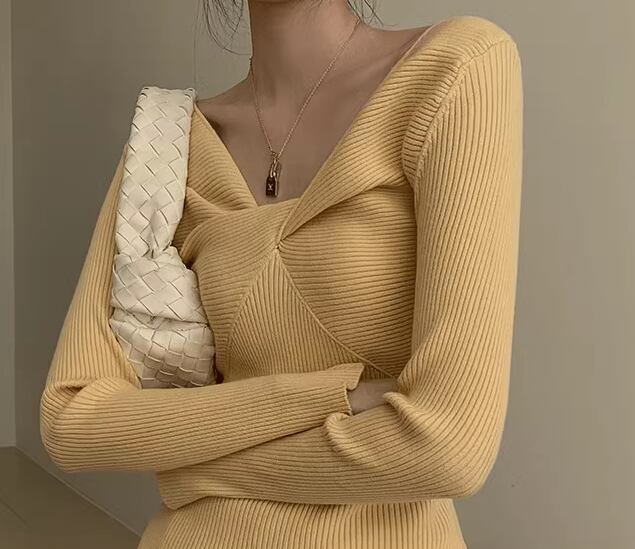 縦長のスクエアネックデザインがおしゃれな長袖のニットセーター。