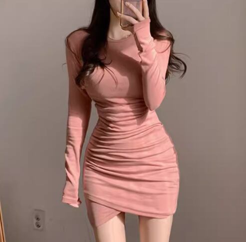 レディース ワンピース プルオーバー ミニ ショート 長袖 ラウンドネック タイト スリム 細身 スマート ウエストマーク ハイウエスト 大人可愛い シンプル おしゃれ かっこいい こなれ感 クール エレガント ラグジュアリー セクシー ハンサム シック 高級感 スタイリッシュ 無地 春 秋 10代 20代 デート お出かけ 韓国 普段使い S M L 小さめ フィット ブラック カーキ ピンク ネイビー