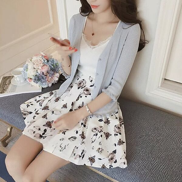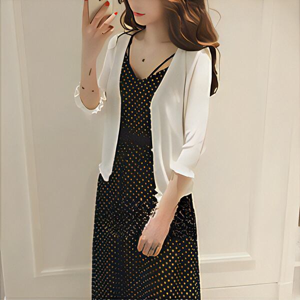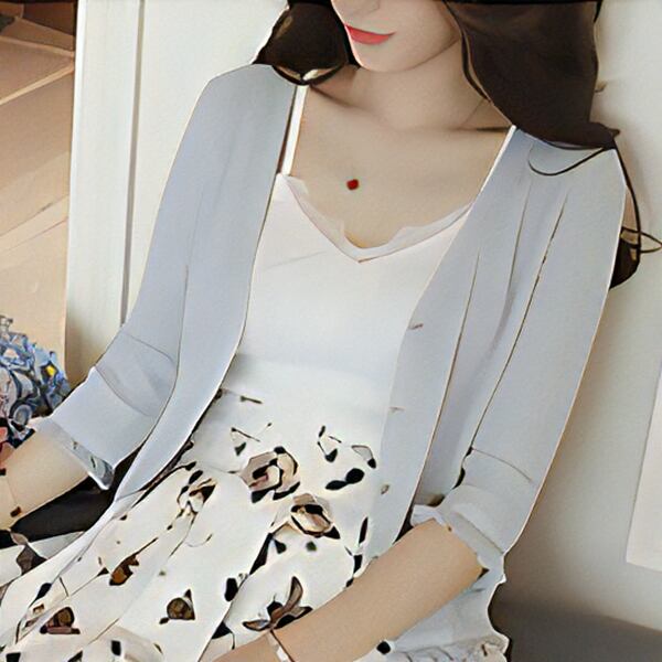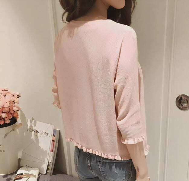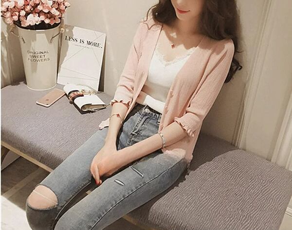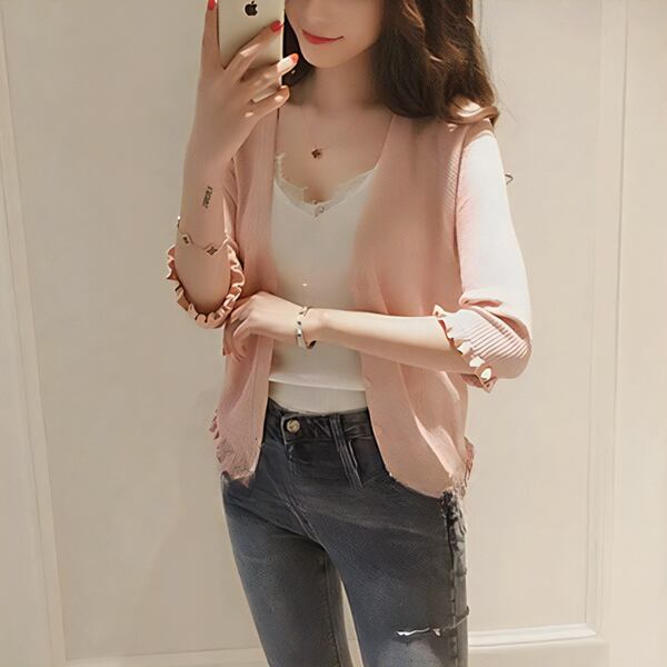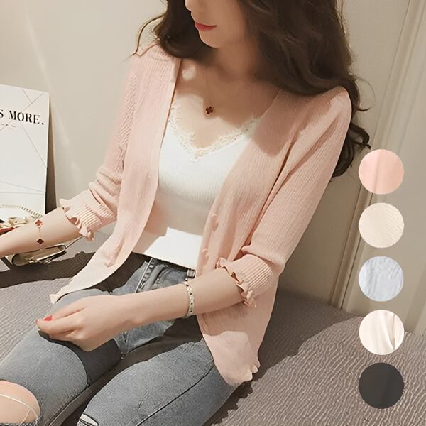 日焼けを防ぎながら涼しさを保つ、ニット薄手のカーディガン。フリルの可愛い長袖が女性らしいアクセント。夏の暑さにも対応し、おしゃれに日焼け対策ができる一枚です。