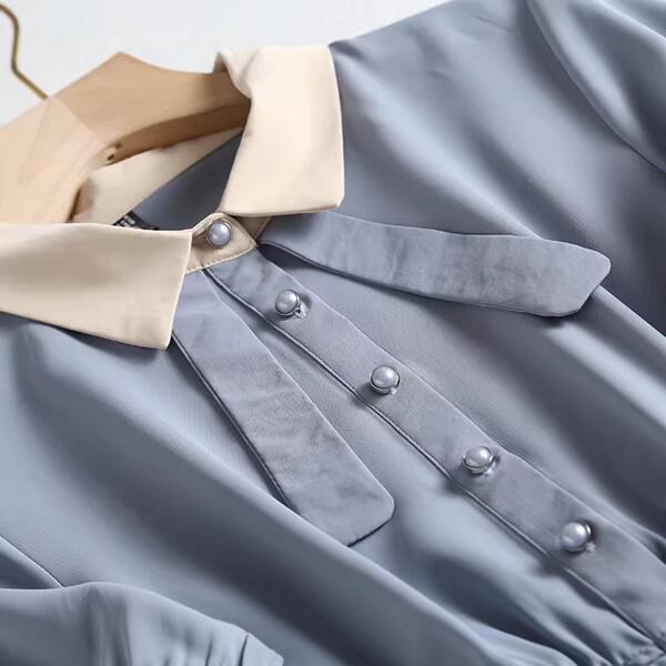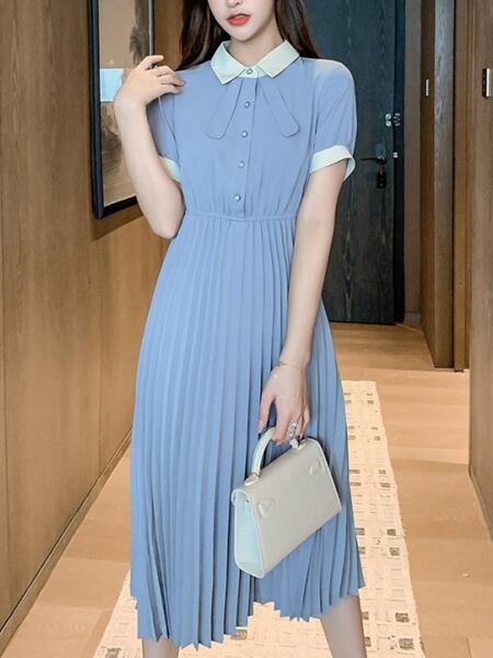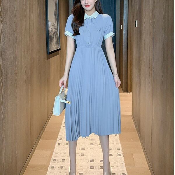 2カラー カレッジスタイルシフォンドレス レディース ワンピース ドレス プリーツスカート フレアスカート ロングスカート ロング 半袖 パフスリーブ ポロカラー りぼんタイ ストレート Aライン フォーマル スマート フェミニン シフォン ハイウエスト ウエストゴム バイカラー パールボタン かわいい きれいめ カジュアル 上品 おしゃれ レトロ こなれ感 ガーリー クール モード系 エレガント クラシカル 知的 清潔感 無地 春 夏 秋 謝恩会 プレゼン パーティー イベント コンサート コンパ
