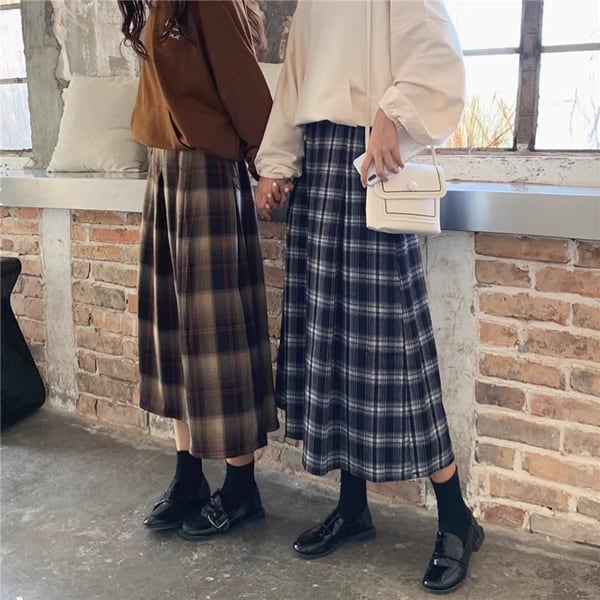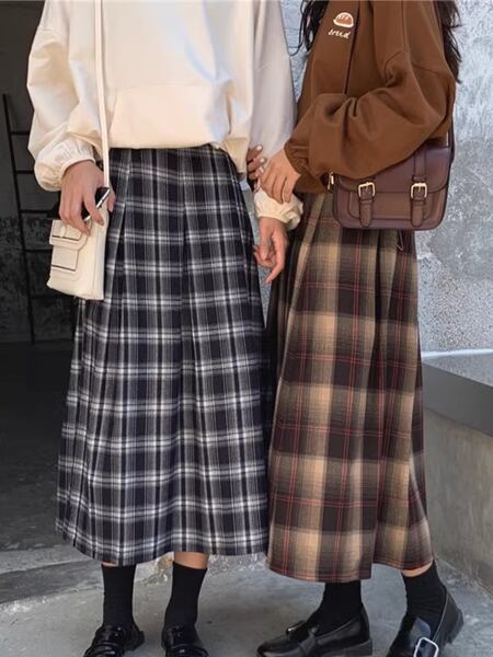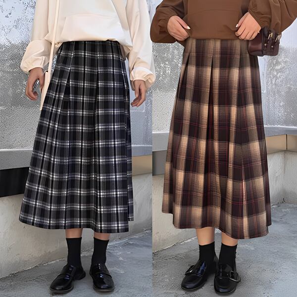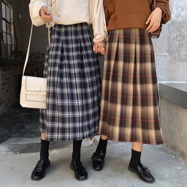 春と秋に活躍する、プラスサイズのAラインレトロスカート。ミッドレングスでハイウエスト設計で、痩身効果も。カレッジスタイルを彷彿とさせるチェック柄とプリーツが特徴。体型カバーとおしゃれを両立した、自信を持って着られる一枚です。