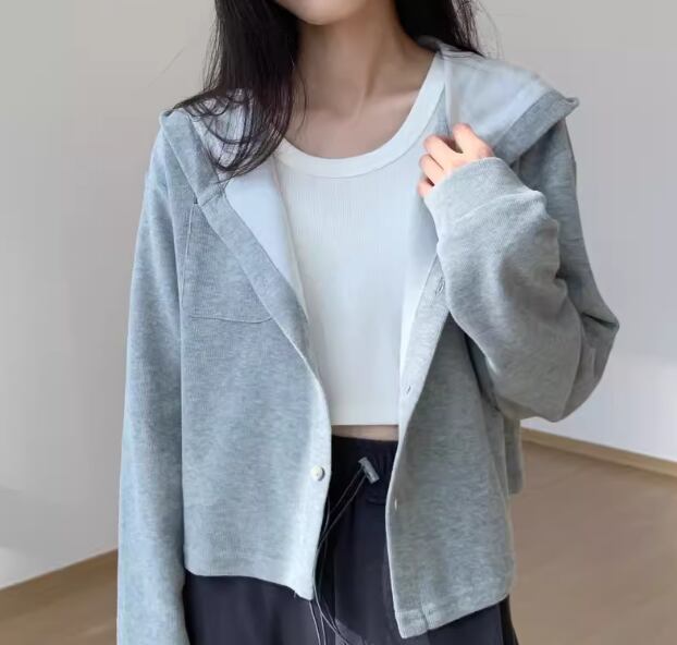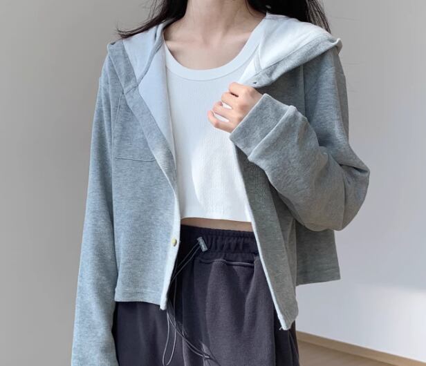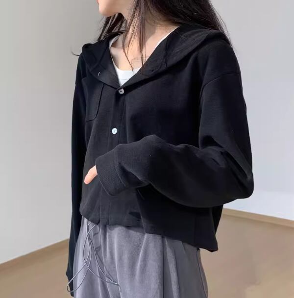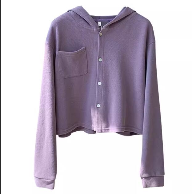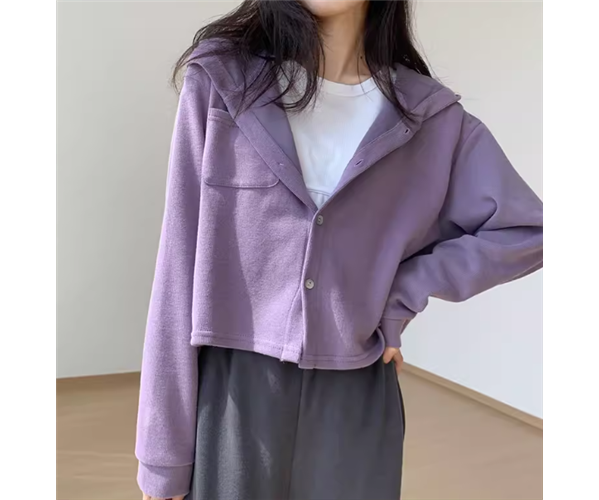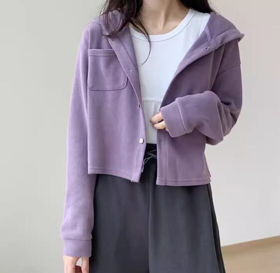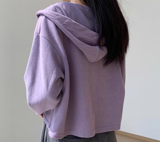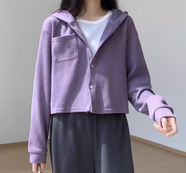 レディース トップス ジャケット パーカー スウェット アウター 上着 羽織 前開き ショート クロップド丈 長袖 フェミニン ポケット 前開き ボタン フード かわいい 大人可愛い きれいめ シンプル カジュアル おしゃれ レトロ ラフ ボーイッシュ ルーズ キュート 無地 春 秋 デート お出かけ 韓国 体型カバー 普段使い 着回し トレンド 流行 S M L ゆったり ゆる 大きめ オーバーサイズ ブラック グレー パープル
