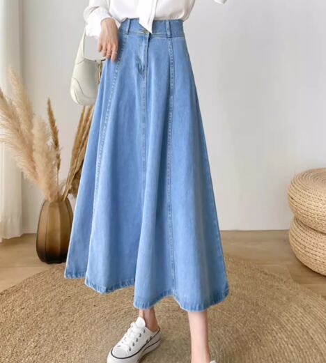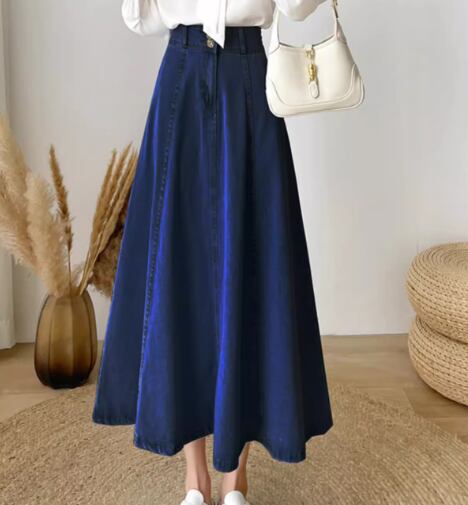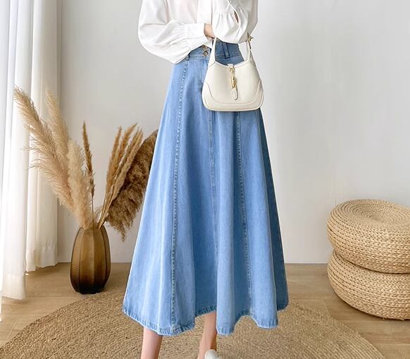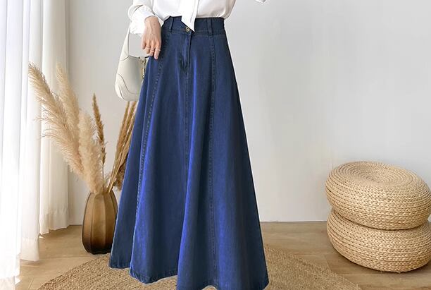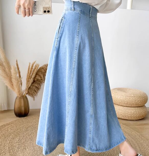 女性らしさを演出してくれる美しいAラインシルエットが魅力的なロング丈のデニムスカート。