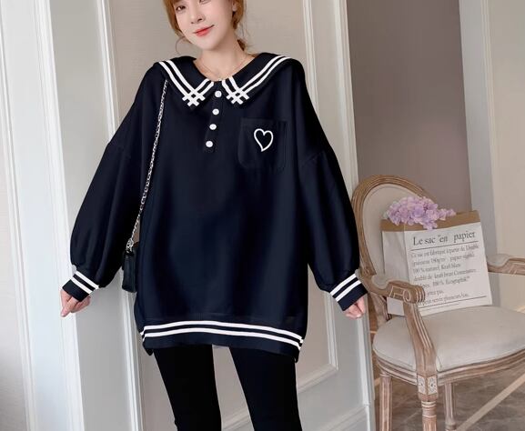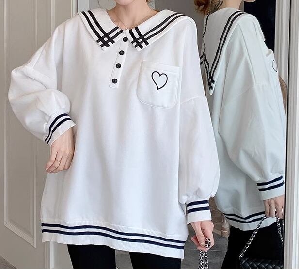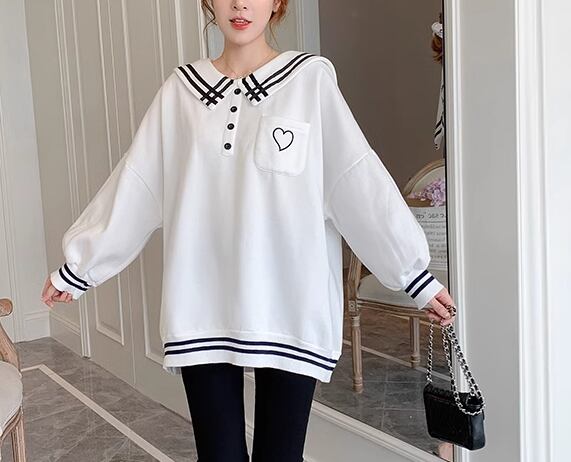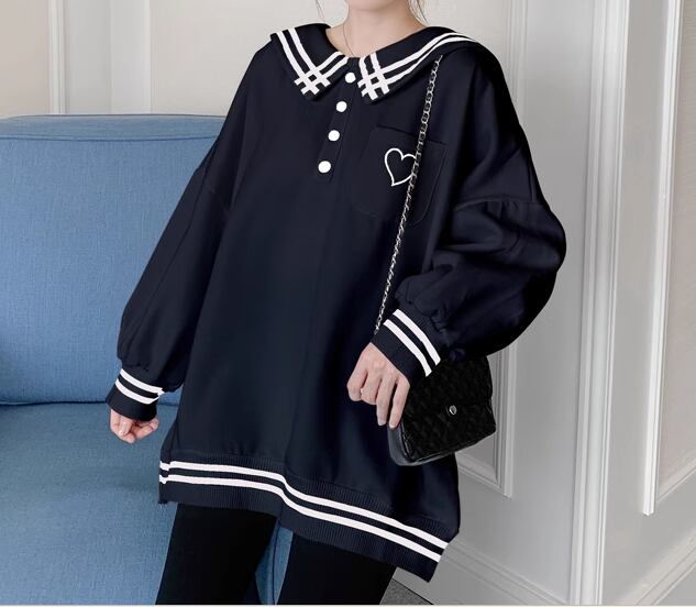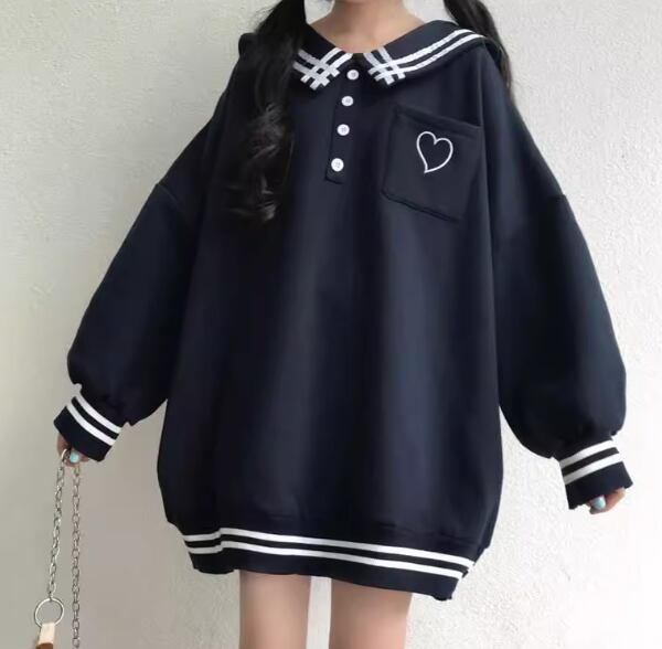 胸元のハートマークと襟、裾、袖部分のラインがおしゃれなアイテムです。