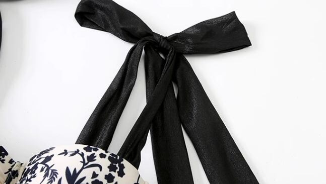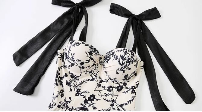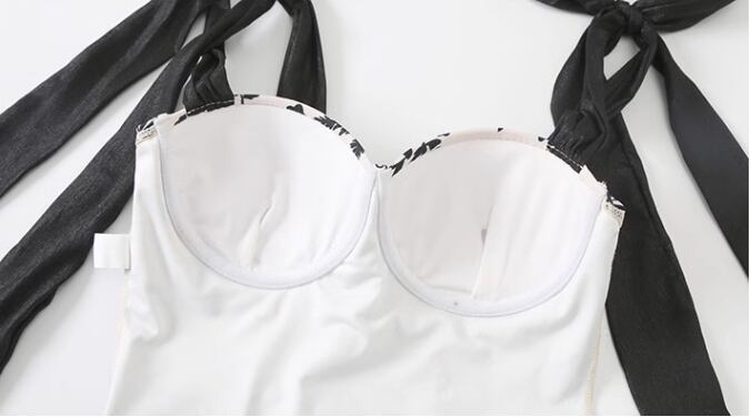 ホワイト×ブラックのシックな色使いと大人っぽいボタニカル柄が魅力的なワンピース水着。