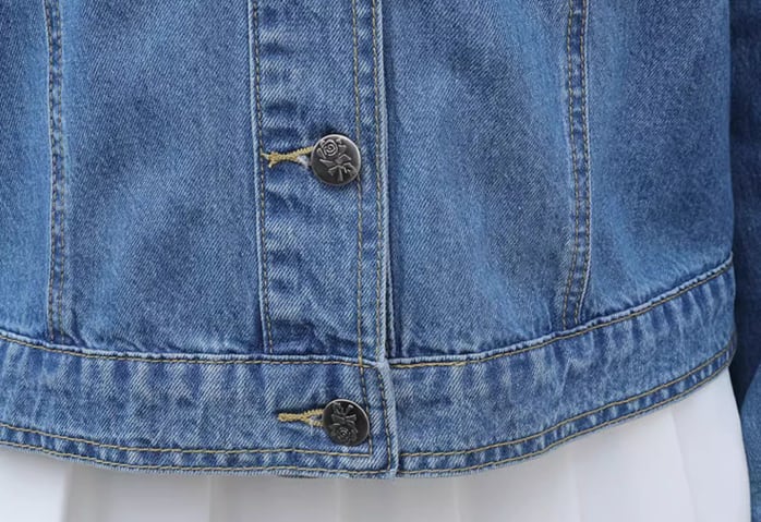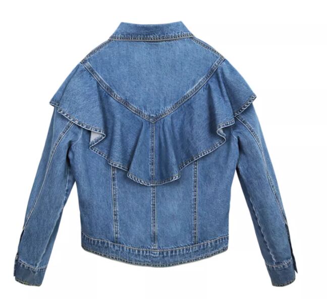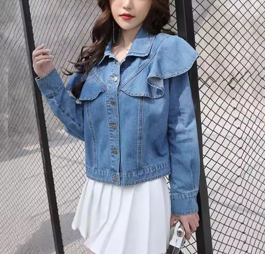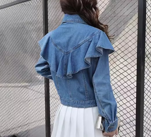 たっぷりのフリルが女性らしさを演出してくれるショート丈の長袖デニムジャケット。