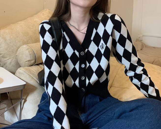ブラック×ホワイトのシックな色使いと大人っぽいアーガイル柄が魅力的なVネックの長袖ニットカーディガン。