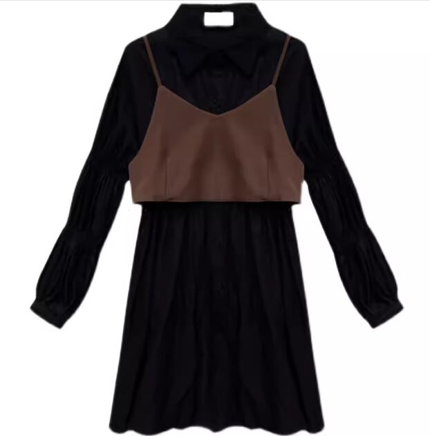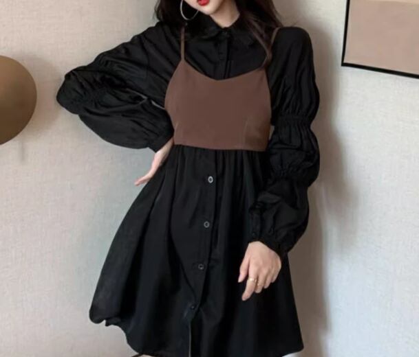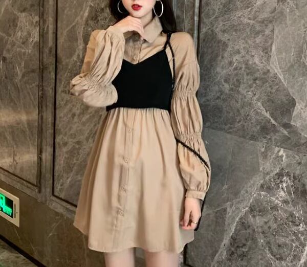 二点セット ツーピース レディース ワンピース シャツワンピ ビスチェ ミニ ショート 長袖 襟付き ポロカラー Aライン ハイウエスト 前開き ボタン かわいい 大人可愛い カジュアル おしゃれ かっこいい レトロ こなれ感 キュート ラグジュアリー ナチュラル シック 高級感 無地 春 秋 10代 20代 学生 デート お出かけ 重ね着 韓国 普段使い 着回し レイヤード S M L XL 大きいサイズ ブラック シャンパン
