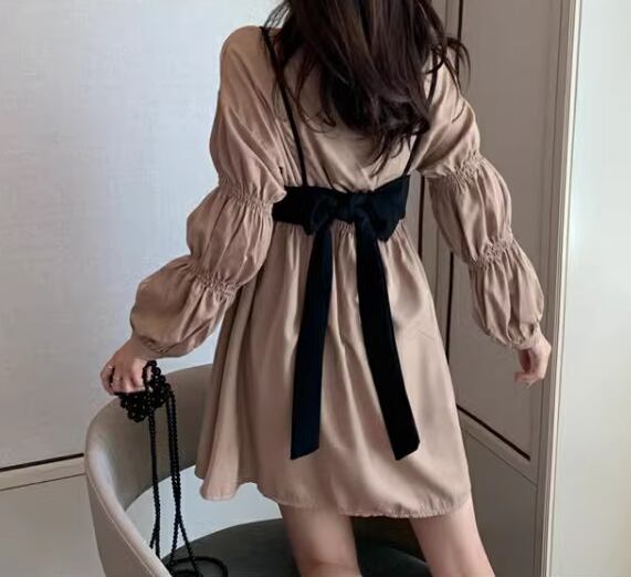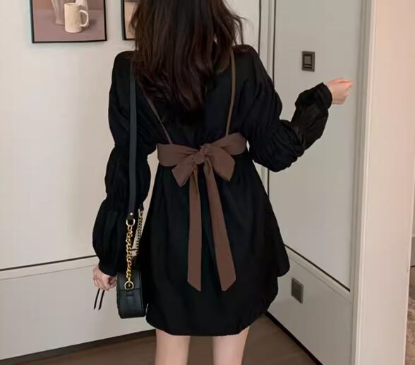 シンプルな長袖のシャツワンピースとバックリボンがアクセントになったビスチェの二点セット。