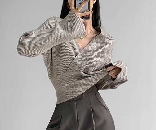 上品で落ち着いた色味とシンプルで洗練されたデザインが大人っぽい長袖のVネックニットセーター。