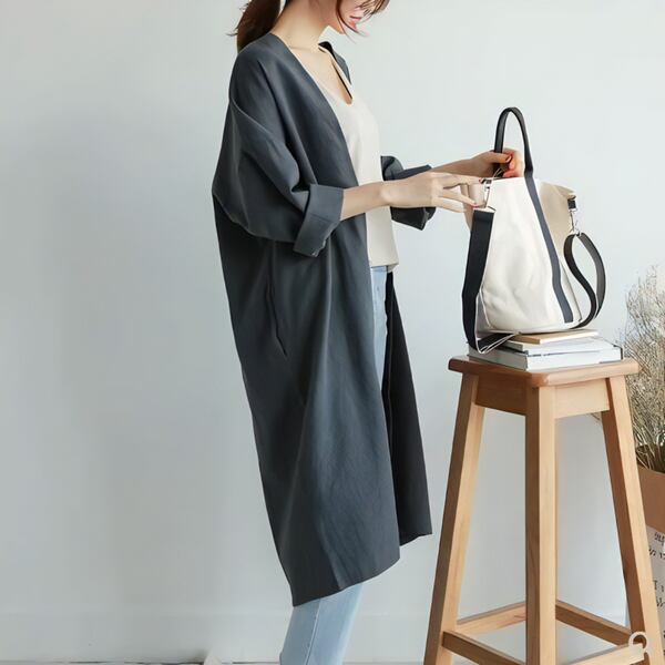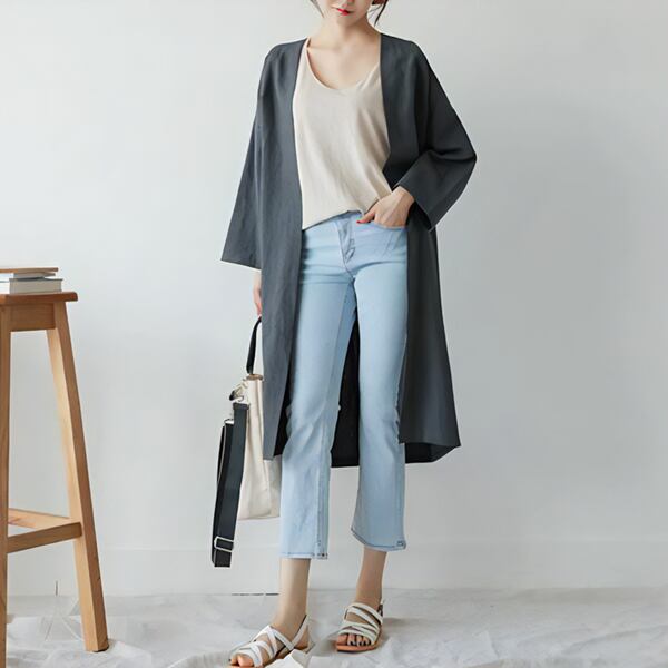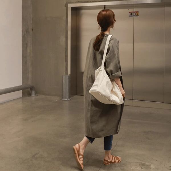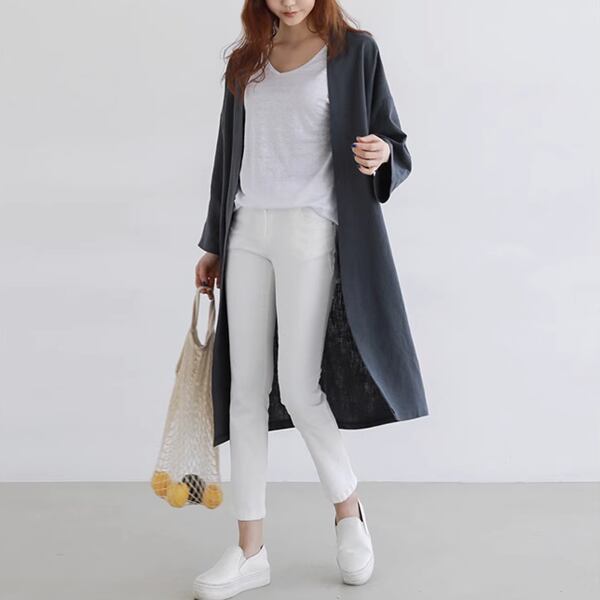 2色展開 レディース トップス ジャケット シャツ カーディガン プルオーバー コート アウター 膝下 ミドル丈 長袖 襟なし ノーカラー ストレート リネン コットン シンプル カジュアル かっこいい レトロ こなれ感 ラフ ルーズ クラシカル ベーシック 無地 夏 秋 20代 30代 通勤 アウトドア ガーデン ライブ オルチャン 体型カバー 日焼け防止 ゆったり カーキ ネイビー