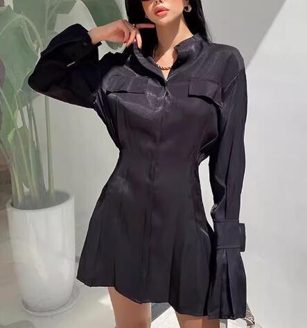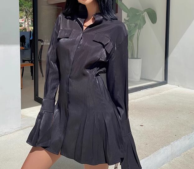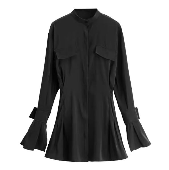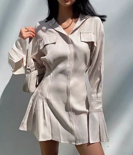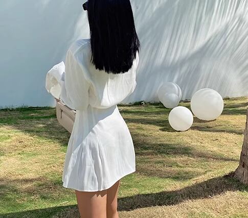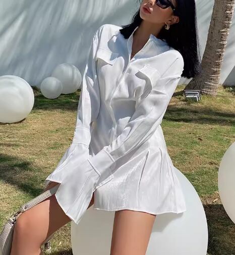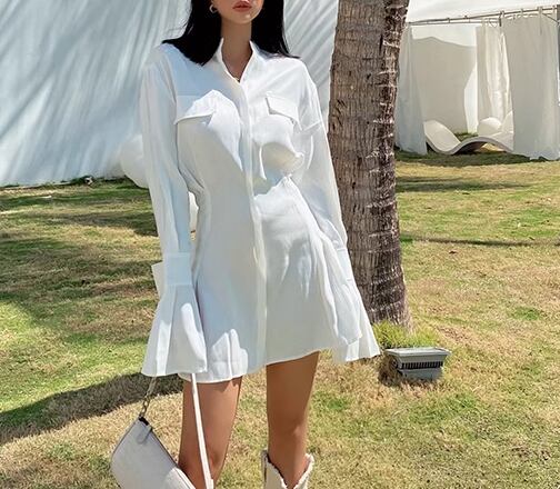 シンプルで洗練されたデザインが大人可愛い長袖のショート丈シャツワンピース。
